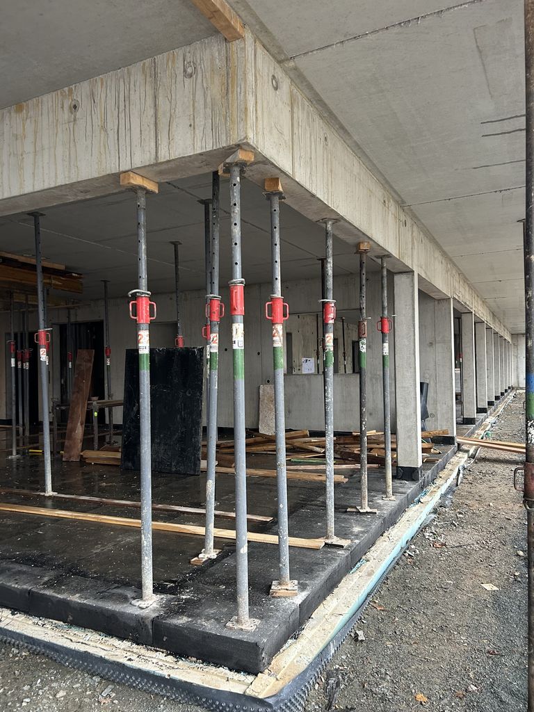 Trotz des kräftigen Regens, der gerade für etwas Wasser im Gebäude sorgt, schreitet der Bau kontinuierlich voran: Immer mehr Luken werden geschlossen, und das Erdgeschoss nimmt Form an.