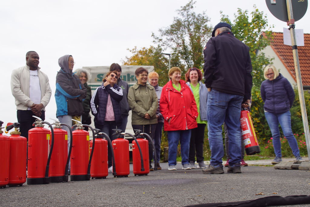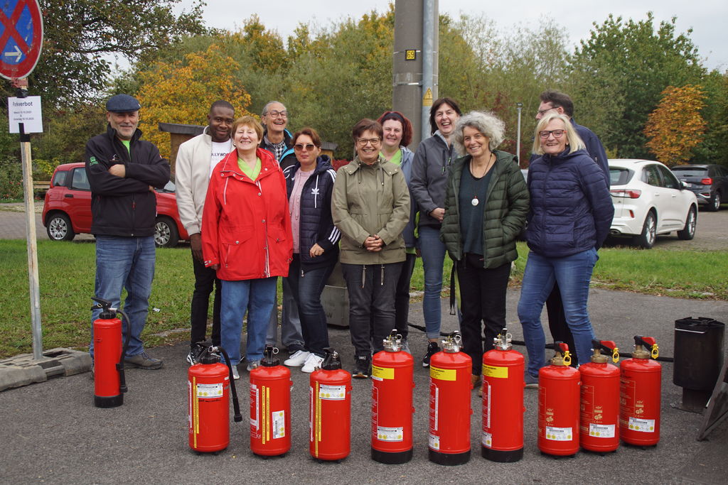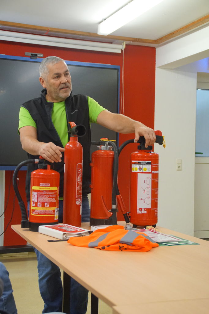 Thomas Helgert, Brandschutzbeauftragter des Unternehmen Dr. Loew, vermittelte uns zuerst sein theoretisches Wissen. Er erklärte uns die Unterschiede der verschiedenen Feuerlöscher, erläuterte uns wo die größten Brandgefahren im Haus sind und sensibilisierte uns wo sich in der Einrichtung die Feuerlöscher befinden.