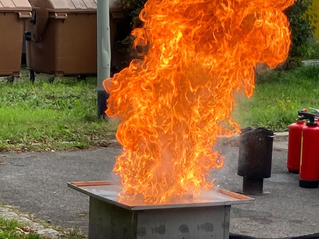 Danach ging es an die praktische Übung. Jeder Mitarbeiter durfte einen simulierten Papierkorbbrand löschen. Die Vorführung einer explodierenden Spraydose, bzw. der Fettbrand in einer Küche vervollständigten die überaus unterhaltsame und informative Fortbildung.