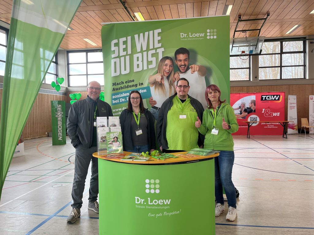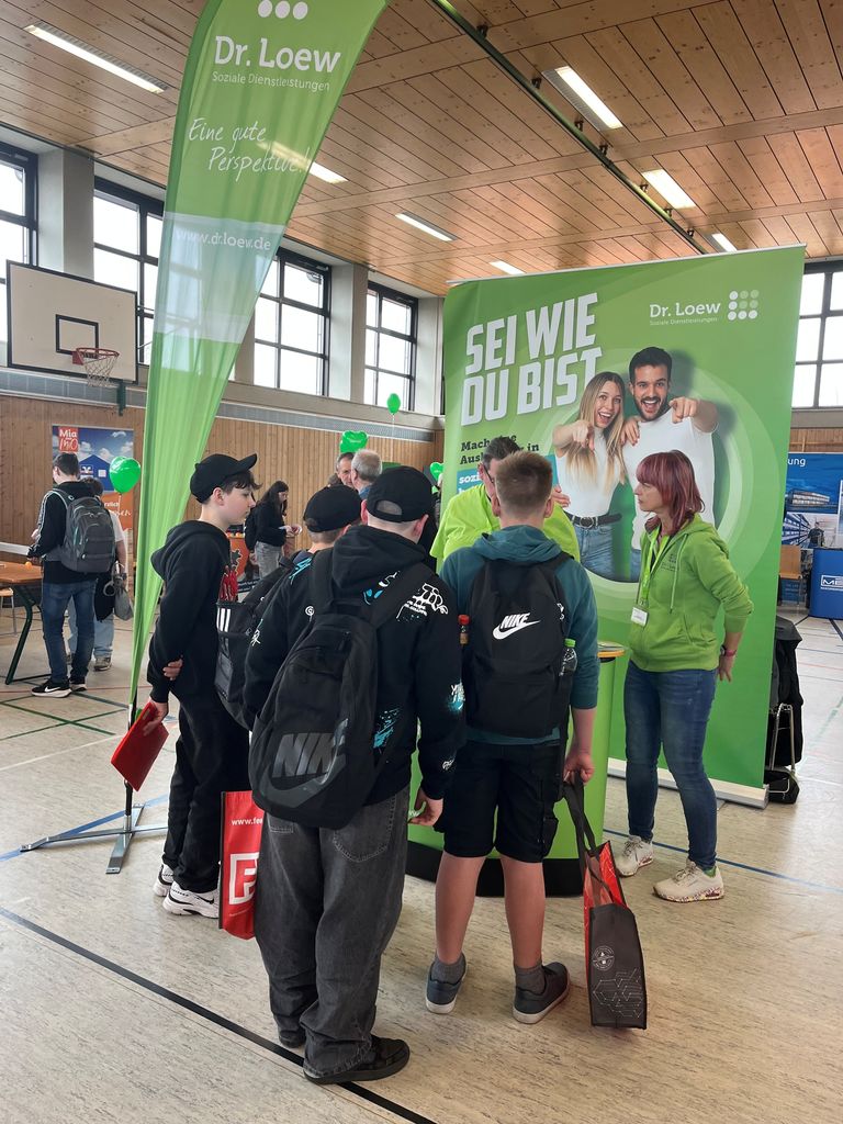 Jägerhof und Tannenschleife in Kooperation mit WernbergBeim jährlich stattfindenden Berufsorientierungstag der Doktor- Eisenbarth- Mittelschule in Oberviechtach waren diesmal die Einrichtungen Jägerhof und Tannenschleife zusammen mit Marlena Klar (Personalreferentin und Ausbilderin Wernberg) mit einem Infostand gemeinsam vertreten. Tobias Kühn, Maximilian Schneyer und Peggy Kulik vertraten die Einrichtungen und informierten interessierte Schüler*innnen und Eltern über die verschiedenen Ausbildungsberufe und Praktikas bei Dr. Loew Soziale Dienstleistungen.