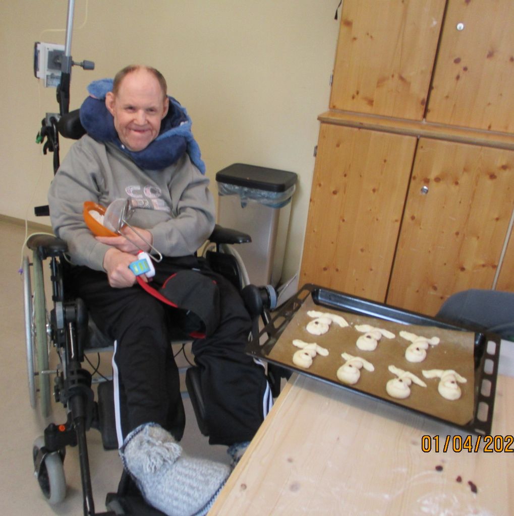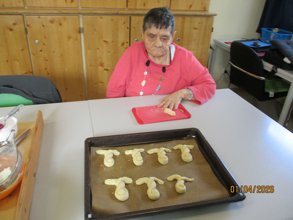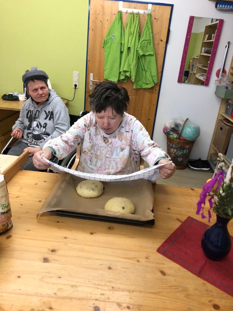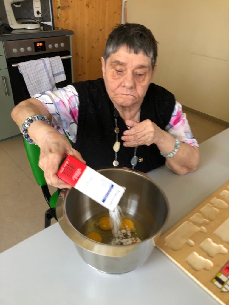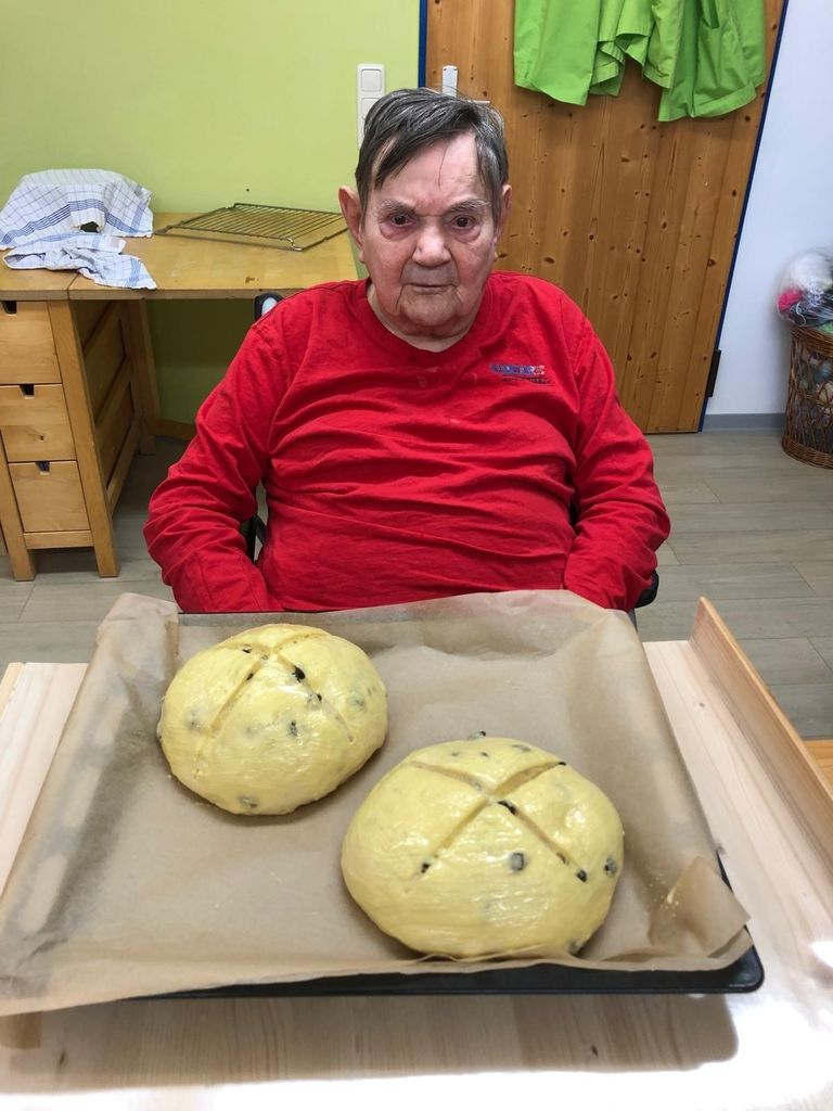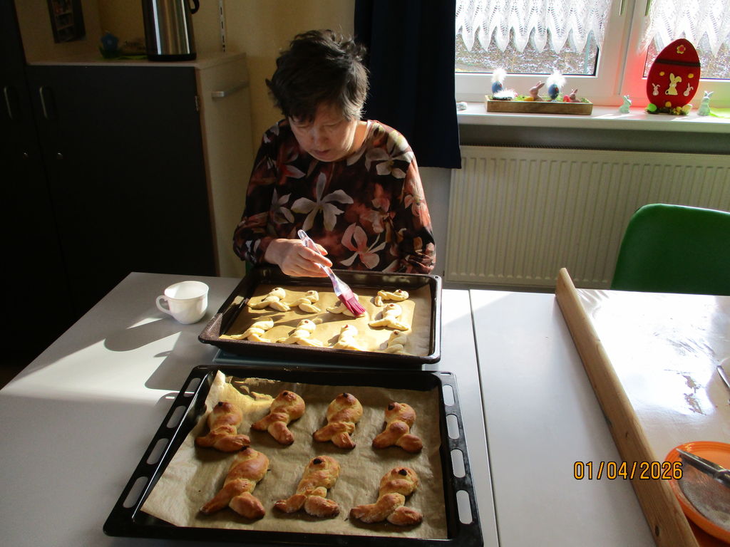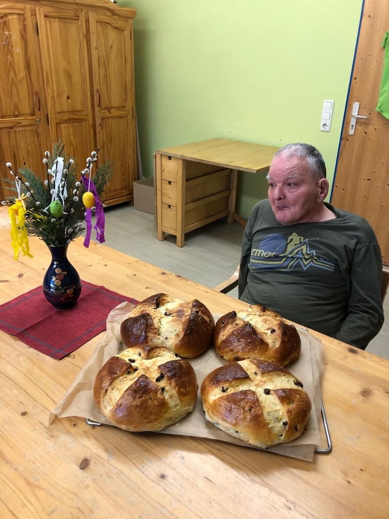 Osterlamm, Palmbuschen, Osterbrot...Unserer Mitarbeiterinnen der Zusatzbetreuung pflegen die österlichen Traditionen und sind schon seit Tagen fleißig am Werkeln. Ein Duft von Hefe und Vanille durchströmte den Jägerhof. Die Bewohner*innen waren emsig bei der Sache und rührten, kneteten, pinselten, schnitten, klebten und zeigten stolz ihre Werke. Und wenn dem Osterlamm mal der Kopf abfiel- kein Problem, der verschwand gleich im Mund. Nun kann Ostern kommen.