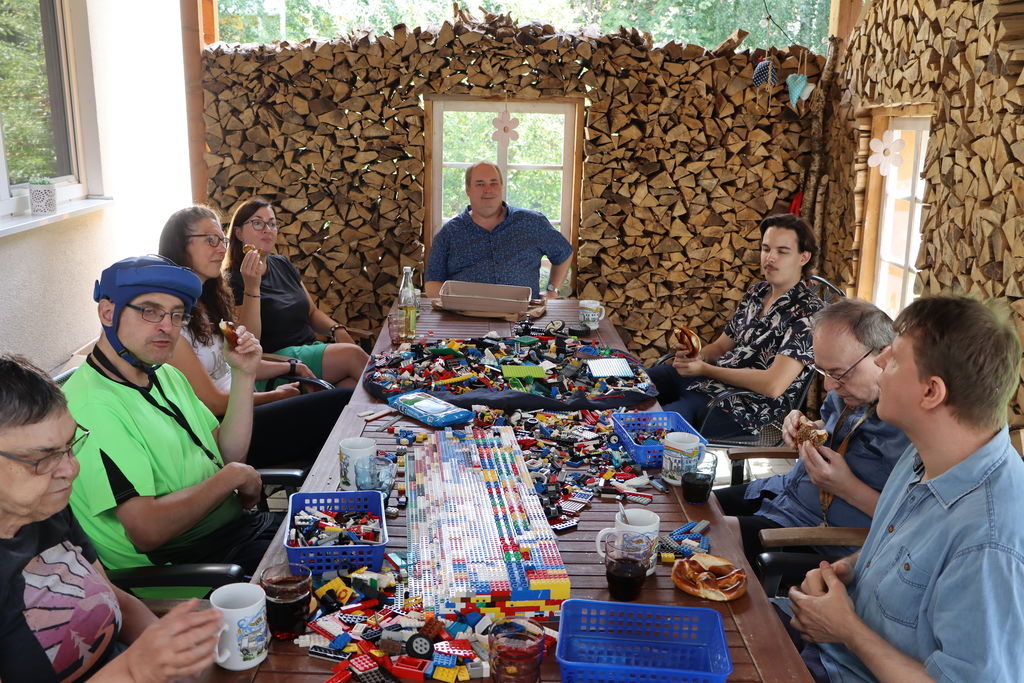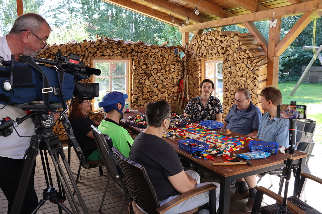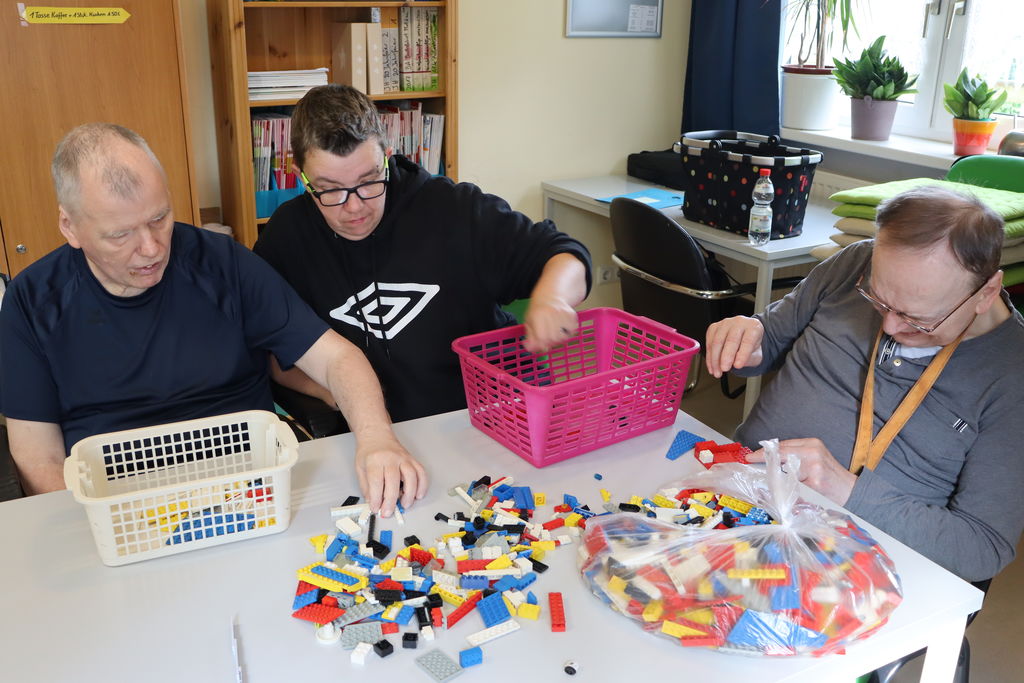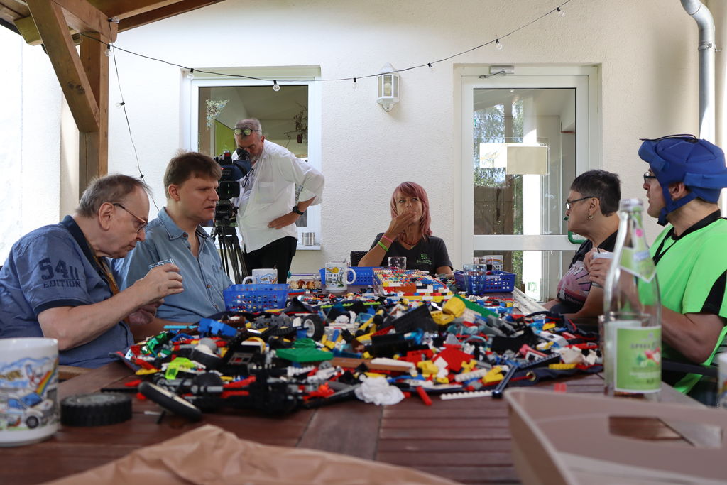 Mit von der Partie waren Bianka Vollath von der Lernenden Region sowie eine ehrenamtliche Mitarbeiterin. Fr. Vollath war bereits im Juni im Jägerhof und brachte Legorampe, Steine, Kleber und Bauanleitung mit. Unsere Bewohner konnten dabei ausprobieren, wie das Sortieren, Kleben und Stecken klappte. Und weil das so gut funktionierte und alle dabei auch noch großen Spaß hatten, fragte Fr. Vollath bei uns an, ob wir das Ganze nochmals vor laufender Kamera demonstrieren könnten. Es wurde also wieder sortiert, geklebt, gesteckt und gehämmert und darüber hinaus wurden die Bewohner noch interviewt. Anschließend gab es eine kleine Stärkung mit frischen Brezen und Kaffee.