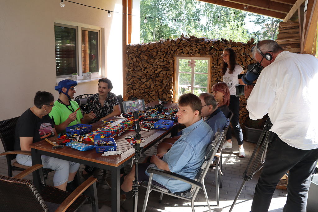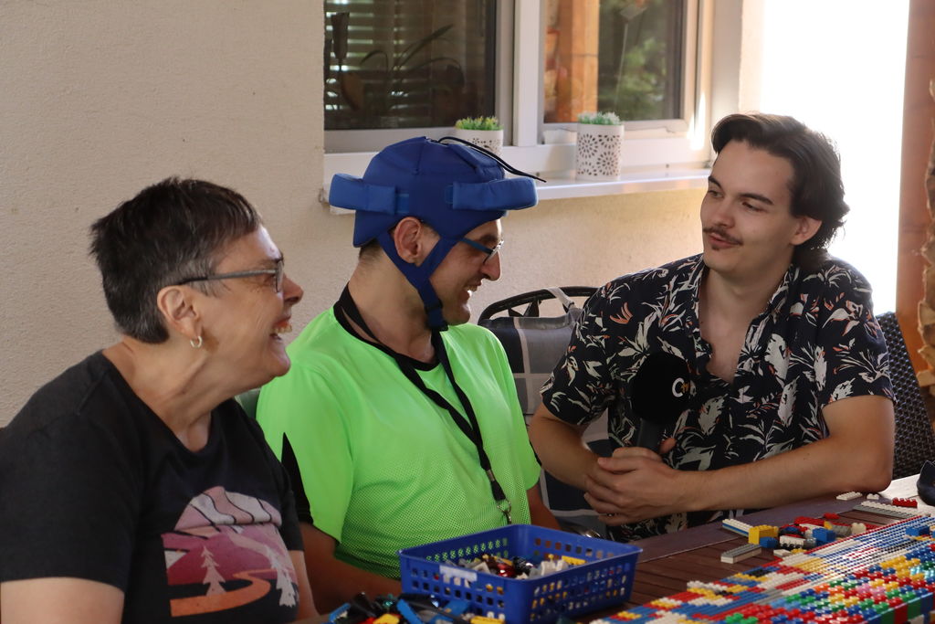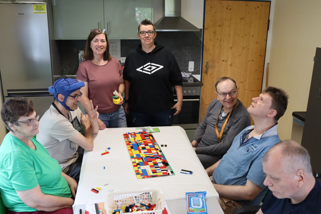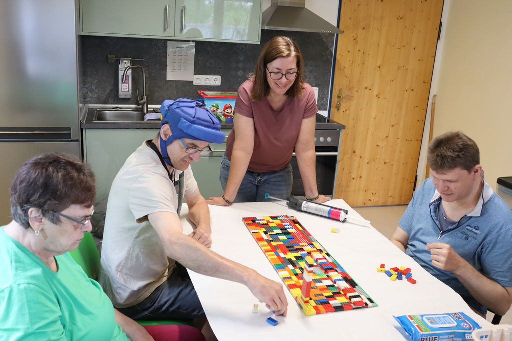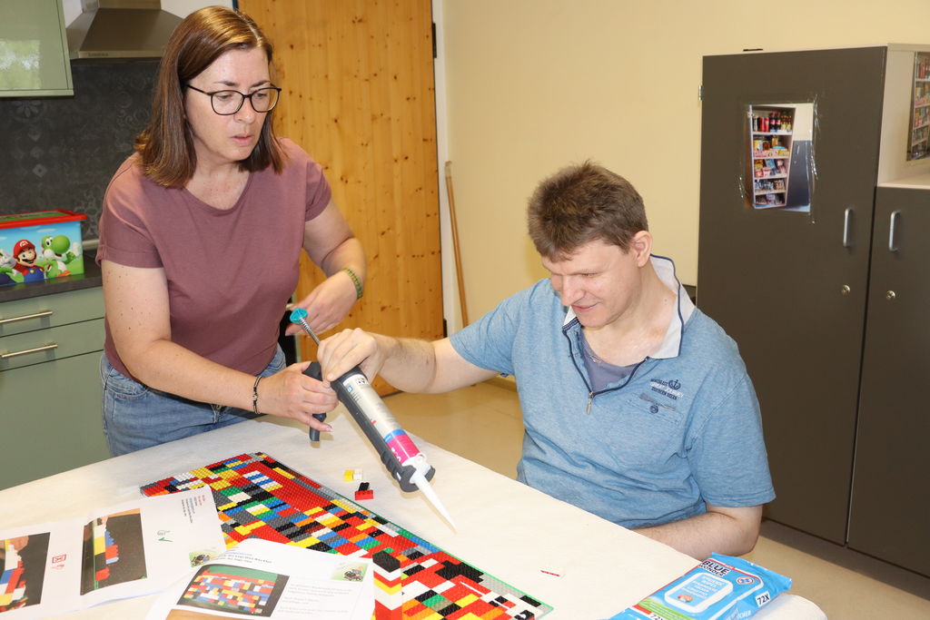 Mit von der Partie waren Bianka Vollath von der Lernenden Region sowie eine ehrenamtliche Mitarbeiterin. Fr. Vollath war bereits im Juni im Jägerhof und brachte Legorampe, Steine, Kleber und Bauanleitung mit. Unsere Bewohner konnten dabei ausprobieren, wie das Sortieren, Kleben und Stecken klappte. Und weil das so gut funktionierte und alle dabei auch noch großen Spaß hatten, fragte Fr. Vollath bei uns an, ob wir das Ganze nochmals vor laufender Kamera demonstrieren könnten. Es wurde also wieder sortiert, geklebt, gesteckt und gehämmert und darüber hinaus wurden die Bewohner noch interviewt. Anschließend gab es eine kleine Stärkung mit frischen Brezen und Kaffee.