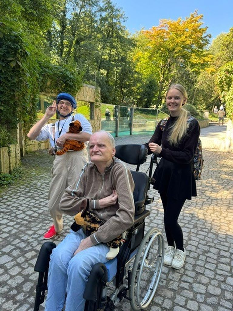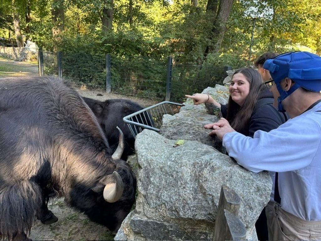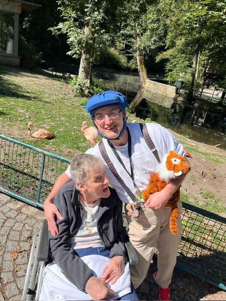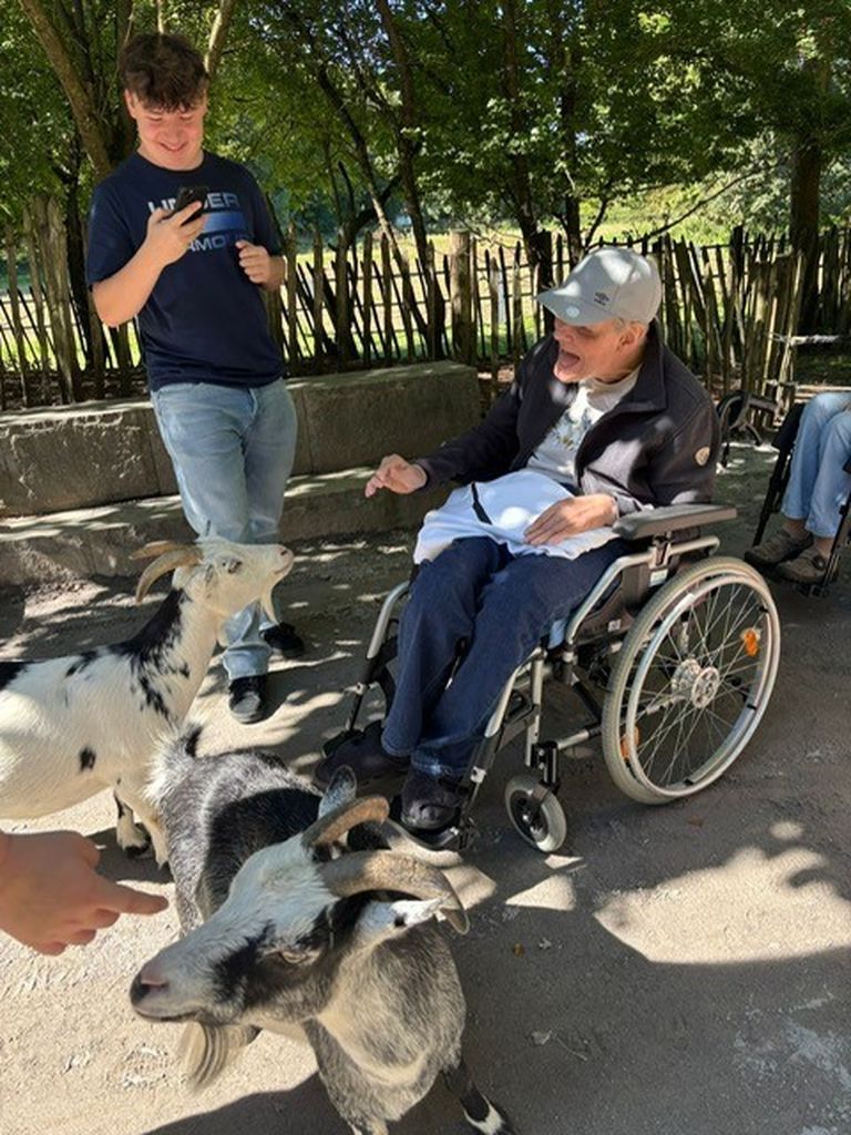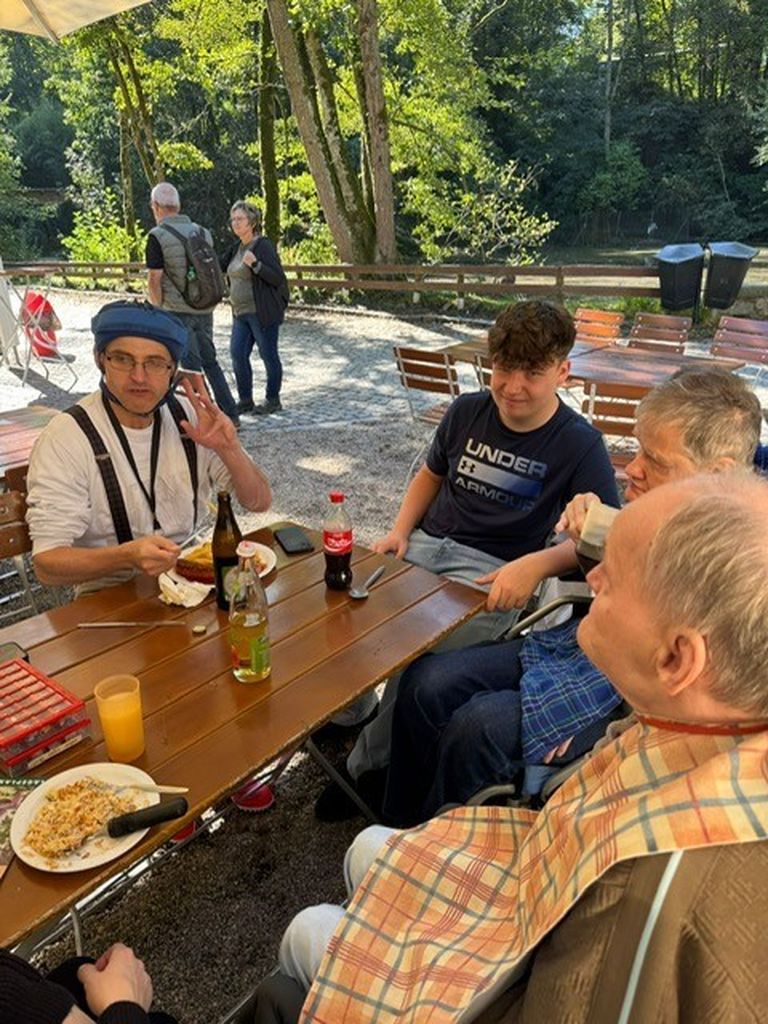 Ausflug in den Tiergarten StraubingJeweils drei Bewohner und Mitarbeiter der Gruppe 4 machten sich an einem sonnigen Donnerstagmorgen auf den Weg in den Tiergarten Straubing.Bereits Wochen vorher herrschte große Vorfreude. Das Wetter meinte es den ganzen Tag gut mit uns.Angekommen, spazierten wir durch den Park und alle waren fasziniert von den vielen exotischen Tieren. An den Gehegen konnten diese hautnah beobachtet werden.Die Mutigen unter uns fütterten im Streichelzoo sogar die (sehr aufdringlichen) Ziegen.Nach dem Mittagessen ging es noch in den Souvenirshop, wo sich jeder Bewohner ein Kuscheltier als Andenken aussuchte.Bevor wir die Rückfahrt antraten, wollte der ein oder andere noch Schaukeln oder auf der Slackline sein Talent beweisen.Heimwärts hielten wir noch in Cham an. Wir versorgten uns im Kaufland mit Leckereien für einen schönen Fernsehabend daheim.Zum Schluss kehrten wir noch in einem chinesischen Restaurant ein, wo wir den Tag Revue passieren lassen konnten.
