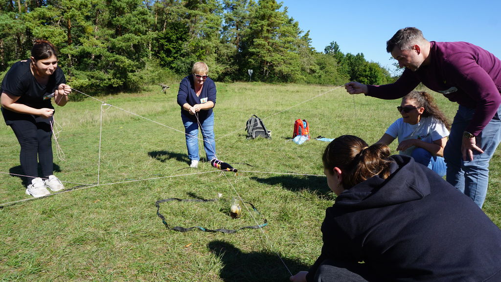Eine der Herausforderungen bestand beispielsweise darin, eine Flasche mit einem Flaschenöffner zu öffnen – allerdings durften wir dabei die Flasche nur mit Seilen berühren. Diese und viele weitere kreative Aufgaben erforderten Zusammenarbeit, Kommunikation und Einfallsreichtum.