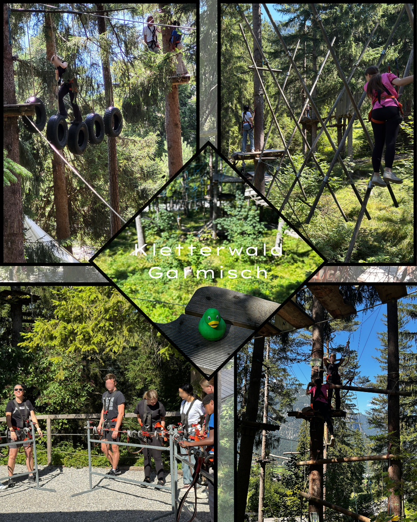 Einen Tag darauf fuhren wir gemeinsam in den Kletterwald nach Garmisch. Obwohl manchen echt Schiss hatten, die hohen Kletterparcoure hinaufzusteigen, haben es viele trotzdem gemeistert und am Schluss waren wir sehr stolz auf uns.