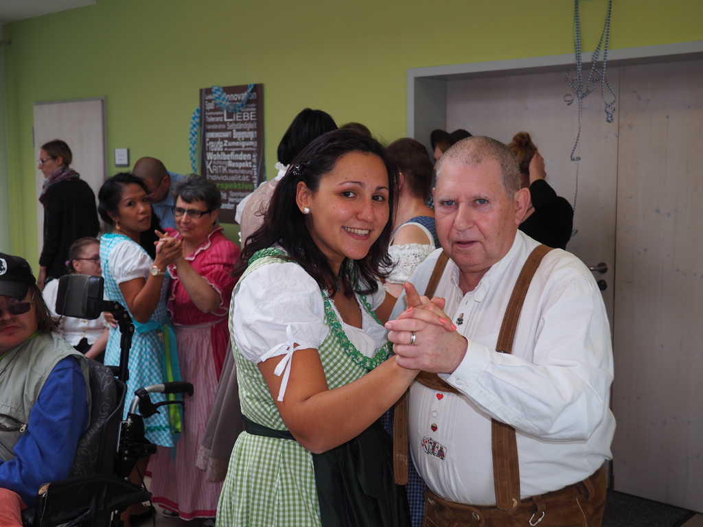 Zur "Quetschn-Musik" wurde getanzt und gefeiert.Am 05.10.2017 fand bereits unser 2. Oktoberfest in Königstein statt. Bewohner und Mitarbeiter feierten ausgelassen bei zünftiger Musik. Auch dieses Jahr zog es unsere feschn Madln und Buam auf die Tanzfläche. Viele der Bewohner und der Mitarbeiter schlüpften in die traditionelle bayrische Tracht, dem "Dirndl" und der "Krachernen".Nach einer kurzen Ansprache des Heimbeirats der Pflege, ging es auch schon los. Beim Maßkrug stemmen konnten die Bewohner ihre Kraft unter Beweis stellen. Auch beim Armdrücken wurden die „Muckis“ ganz schön strapaziert. Am Abend gab es Weißwurst, Brezen und „Obazdn“. Beim gemütlichen Beisamensein wurde auch so manches Lied angestimmt.