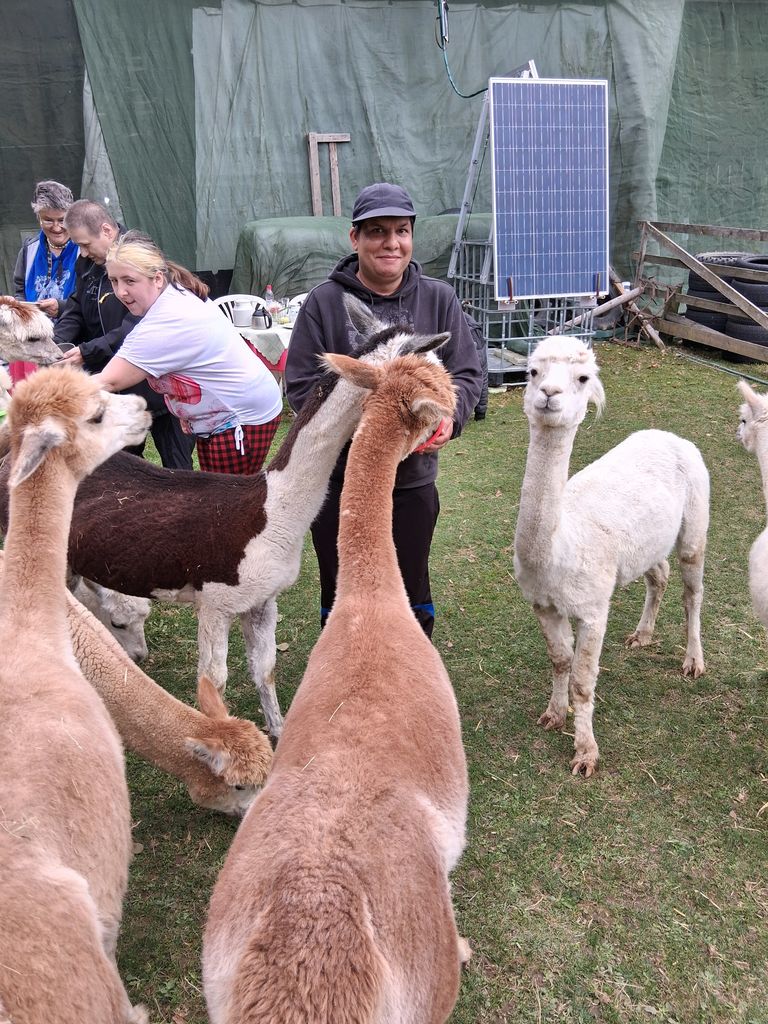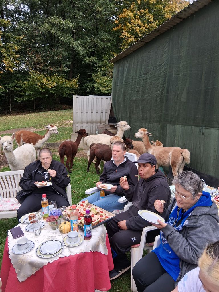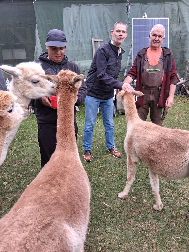 Am 28.9.2025 machten sich fünf mutige Bewohner aus dem Bereich Mertenberg auf den Weg zur flauschigen Alpaka-Truppe „Alpakaimperio“ in Tännesberg.Wir verbrachten einen herrlichen Nachmittag direkt auf der Weide mitten in der Alpaka-Herde. Die neugierigen Tiere suchten ganz von selbst den Kontakt zu uns, und die Farmbesitzer:innen versorgten uns mit jeder Menge kuriosem Wissen über diese faszinierenden Geschöpfe. Beim gemeinsamen Kaffeeklatsch mit hausgemachtem Kuchen und belegten Brötchen wurden sämtliche Fragen mit Engelsgeduld und Augenzwinkern beantwortet. Der absolute Gipfel der Freude war dann die Fütterung der Alpakas – das war ein Riesenspaß! Ein unvergesslicher Nachmittag für Groß und Klein.
