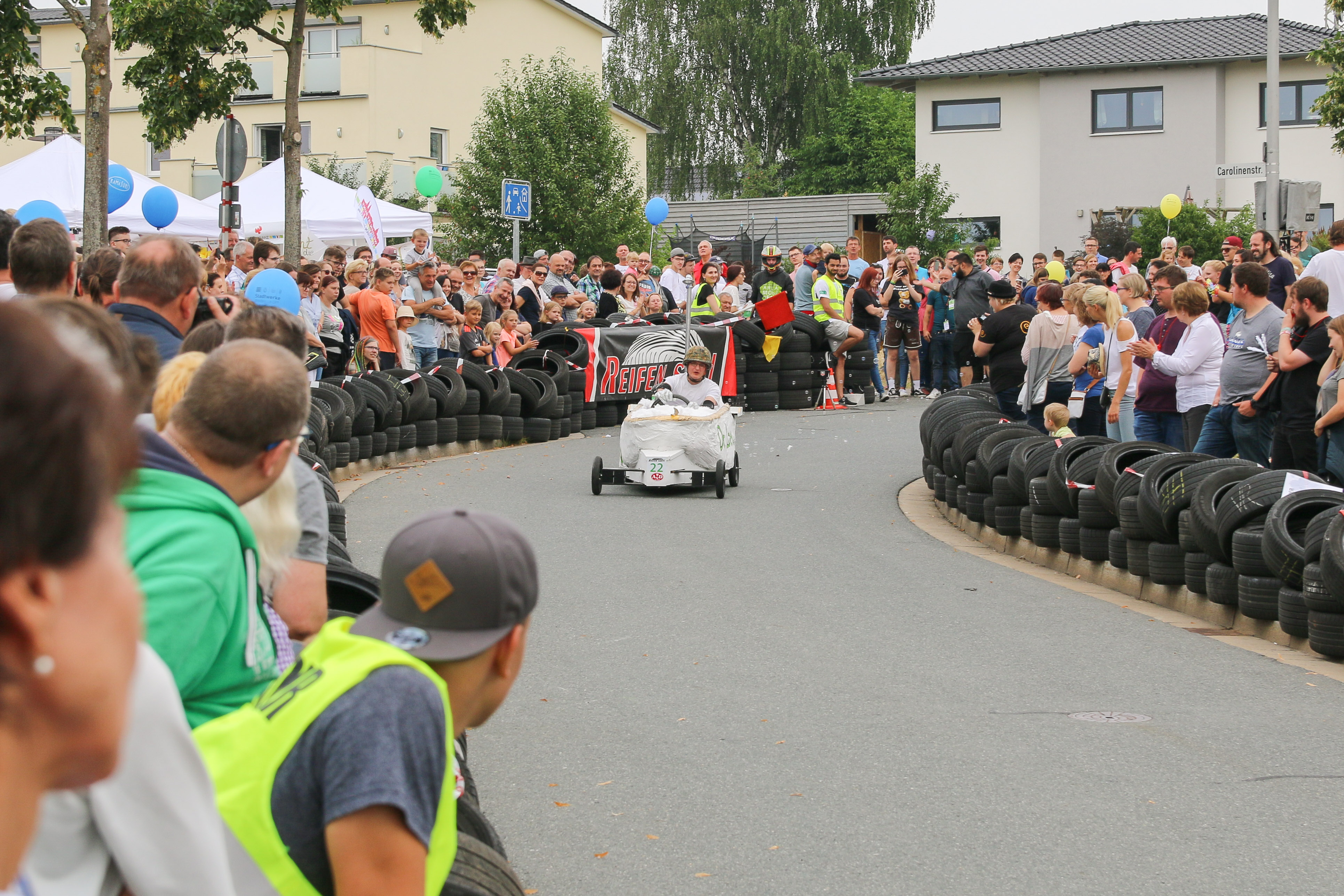 Nach einer kurzen Verschnaufpause inklusive Speis und Trank ging es nun zum eigentlichen Rennen mit drei Durchläufen. Leider konnte hier unsere „Zündi“ und unsere „Soapbox“ nicht mehr durchstarten, da beide durch die Bekanntschaft mit der Fahrbahnbegrenzung einen Achsschaden bzw. einen Reifenplatzer erlitten haben. Deshalb feuerten wir unsere „Bulls Eye“ und unsere „Blubberwanne No. 50“ um so lauter an. Alles ging gut, die Kisten flitzten die 330 Meter lange Strecke hinab und der Moderator von Ramasuri, Markus Pleyer, unterhielt die über 6.000 begeisterten, johlenden und klatschenden Zuschauer immer mit Geschichten und Hintergründen über die Entstehung der fahrenden Kisten.