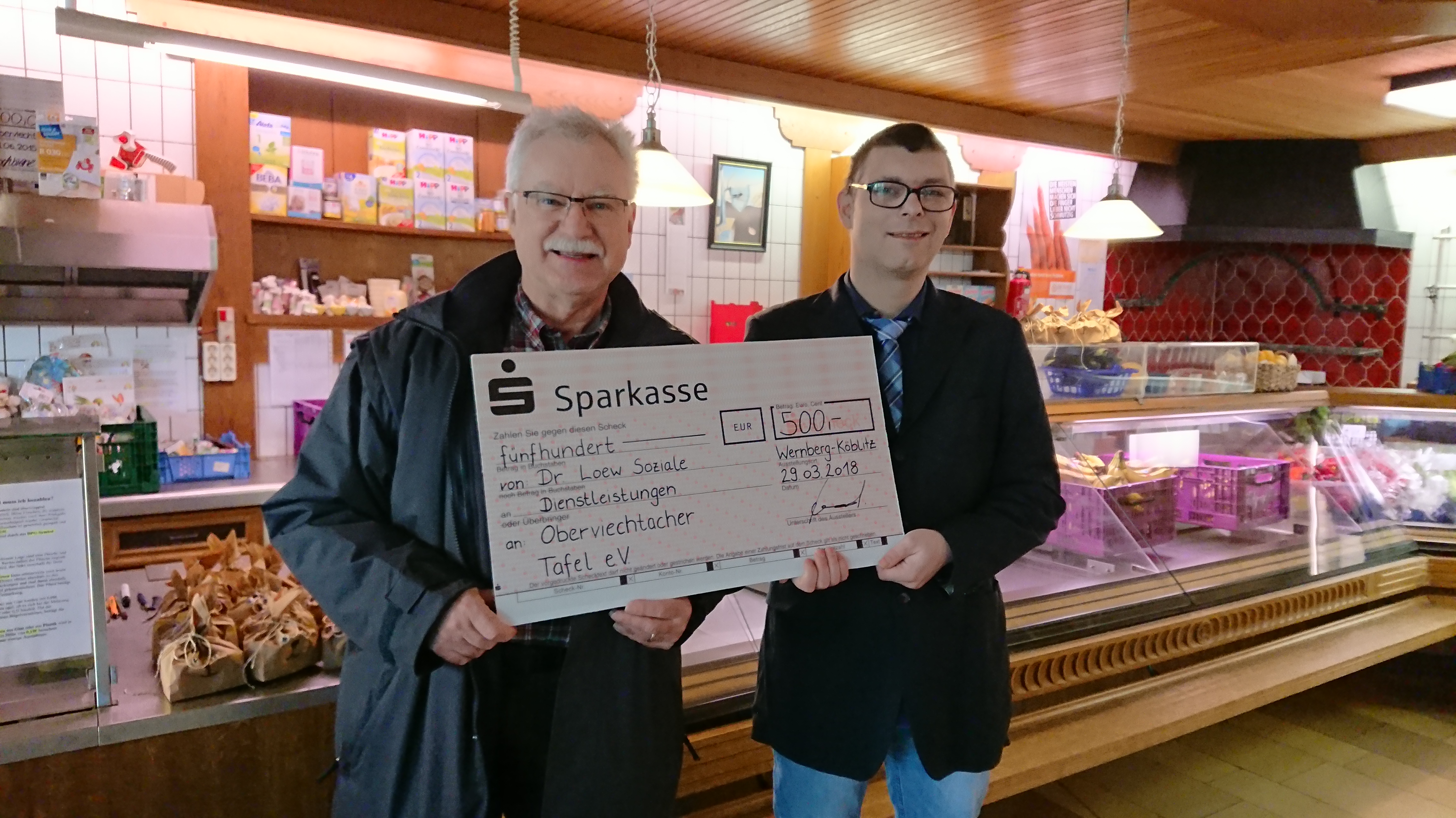 Dr. Friedrich Keller, 1. Vorsitzender der "Tafel" in Oberviechtach, zeigte sich sehr erfreut über die Aktion als auch über den Spendenscheck in Höhe von 500,- € den unser Heimbeirat Thorsten Lang zusammen mit Einrichtungsleiterin Irena Jung übergab. Thorsten wird zukünftig auch weiter die Tafel unterstützten und bei den Lebenmittelsammelfahrten als Unterstützung mitfahren.