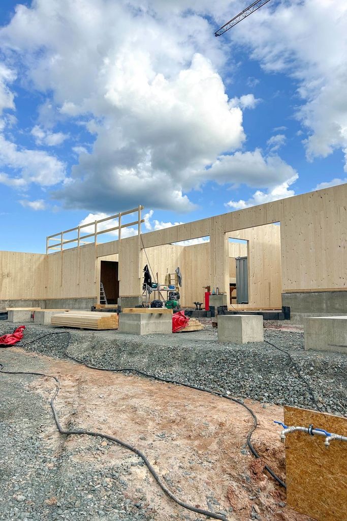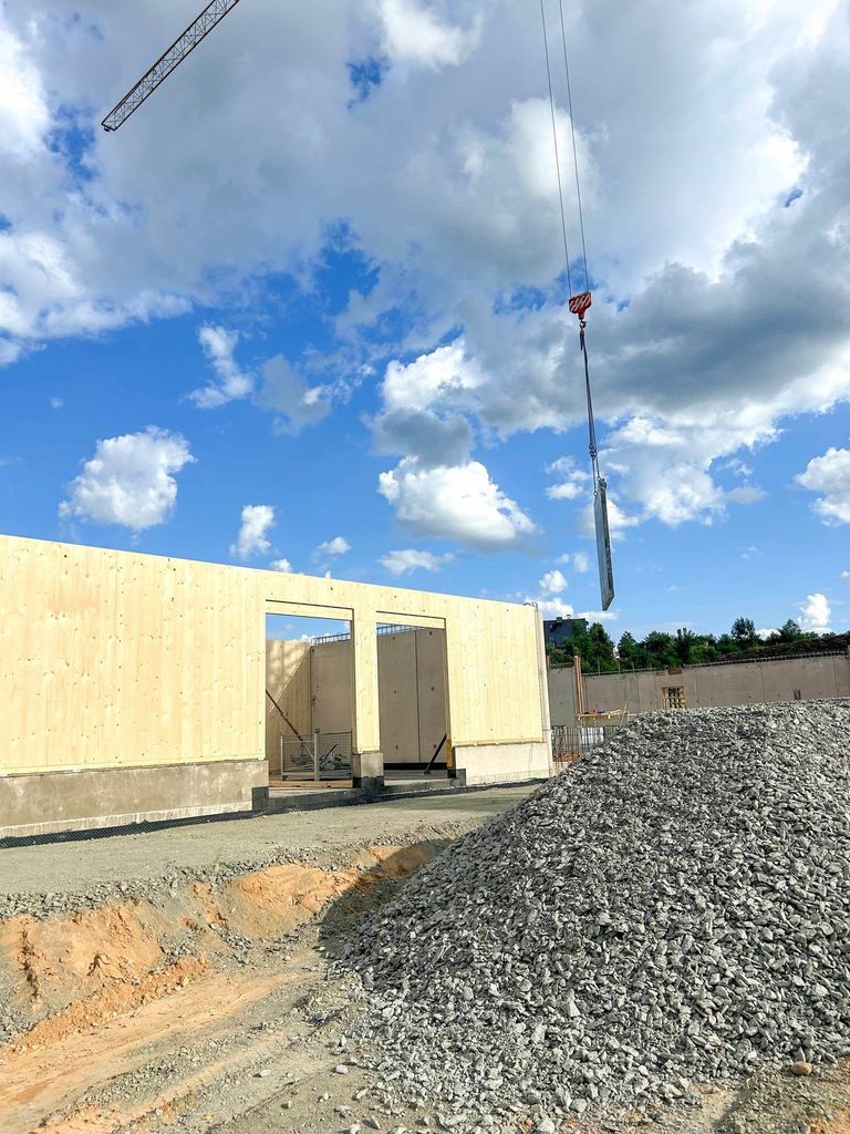 Mit beeindruckender Präzision setzen die Bauprofis aktuell die vorgefertigten Holzmodule zusammen. Durch die bereits sichtbaren Fenster- und Türöffnungen lässt sich das zukünftige Raumkonzept gut erahnen: hell, offen und einladend – ganz so, wie man es sich für ein Zuhause zum Wohlfühlen wünscht.