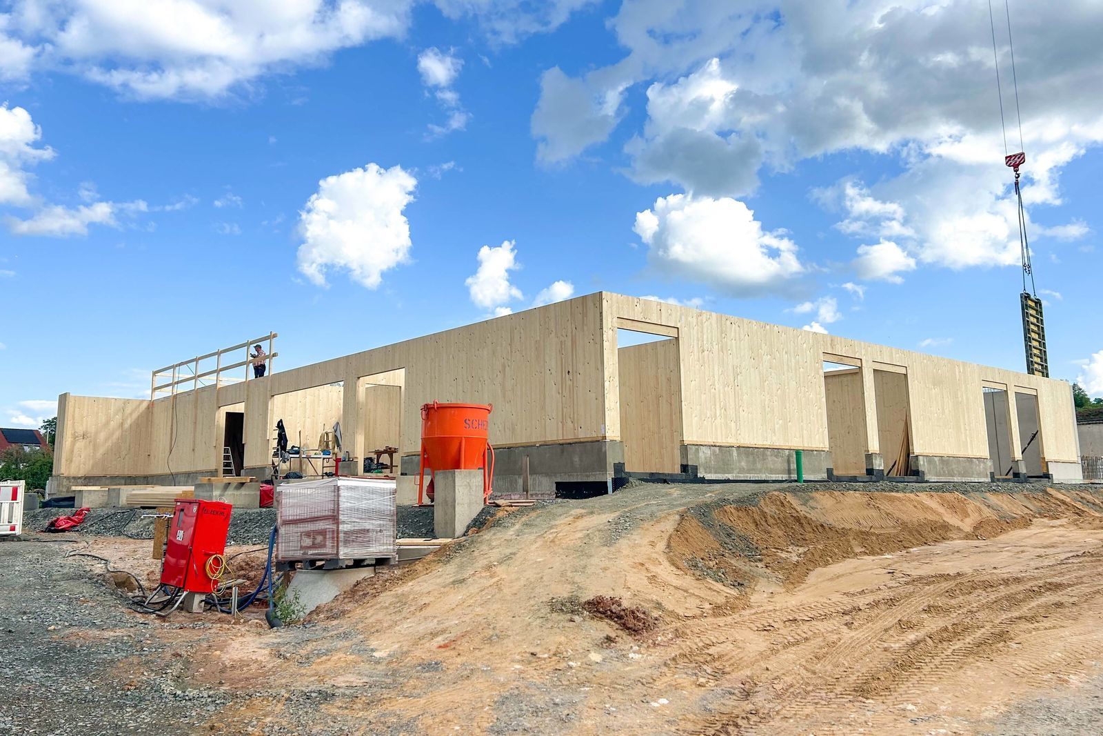 Wo noch vor wenigen Wochen Fundamente gegossen wurden, steht nun bereits das Erdgeschoss – gefertigt in moderner Holzbauweise, die sowohl optisch als auch ökologisch überzeugt.