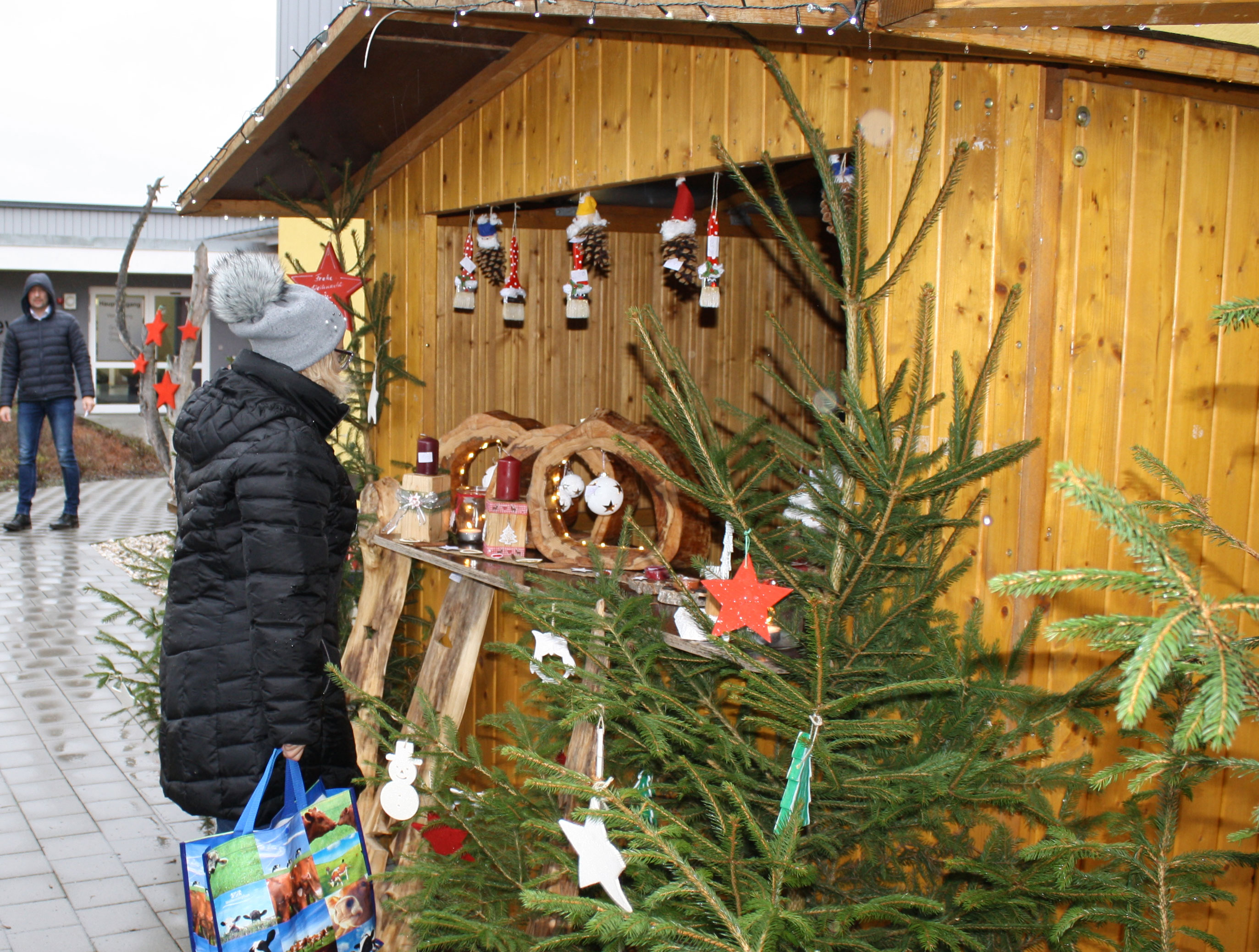 Im Eingangsbereich des Pflegeheims war eine kleine Budenstadt aufgebaut, an der schöne Dekorationsartikel erworben werden konnten. Sternenbretter, Gewürzkerzenleuchter oder Hohle Holzstammkreise mit schönen Weihnachtskugeln behängt standen neben vielem anderen zur Auswahl.