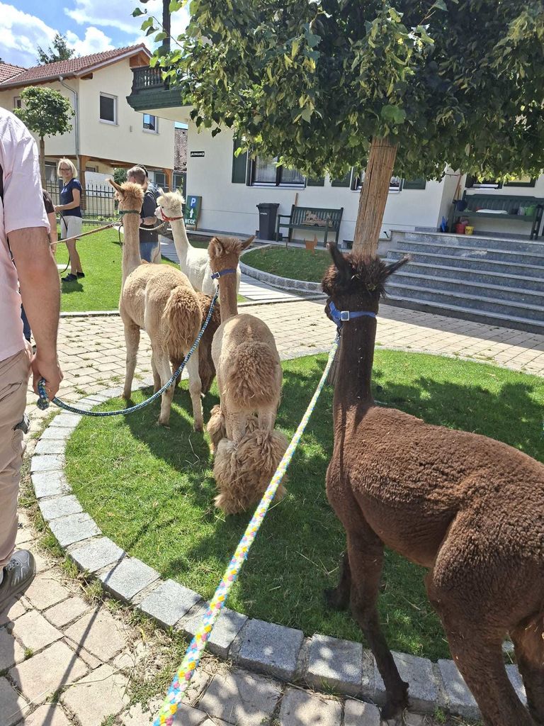 Auch hier gab es Babys zu bewundern, auch diese durften auf den Arm genommen werden. Nachdem uns dann Dagmar einiges über die Alpakas erzählt hatte, wurden einige von ihnen gehalftert und dann ging es auch schon los. Zuerst wurden die Alpakas noch geduscht, denn das Fell der Alpakas ist sehr dicht und sie würden beim Spaziergang zu sehr schwitzen. Den Alpakas gefiel dies sehr gut, auch mancher Bewohner wurde nass, denn die Alpakas schüttelten sich kräftig nach der Dusche. Jeder Bewohner der wollte, durfte ein Alpaka führen. Wir gingen mit ihnen eine große Runde spazieren. Hier mussten wir uns an die Geschwindigkeit der Alpakas halten (sie gingen sehr langsam und genossen auch sehr oft das frische Gras) und das fiel einigen Bewohnern schwer. Sie wollen einfach schneller gehen. Aber mit der Zeit gewohnten sie sich an das Tempo der Tiere und genossen den Spaziergang.