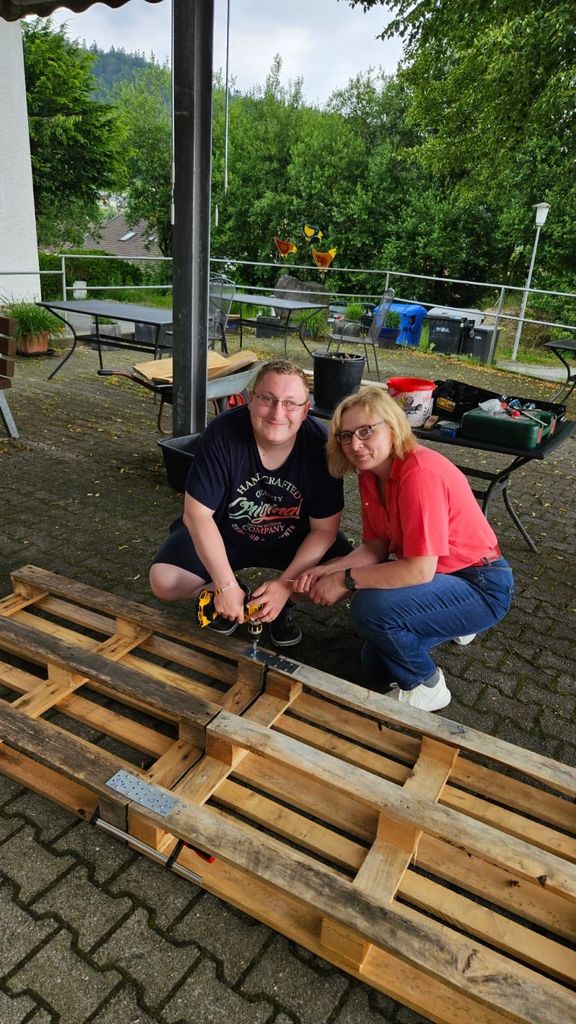Da unsere Bewohner*innen sich einig sind, das im Sommer leckerer Salat mit frischen Kräutern nicht fehlen darf, entstand die Projektidee zum Hochbeetbau...Sofort traten unser Bewohner Herr Ricky Läufer mit Mitarbeiterin Frau Regina Oswald in die Planung. Zuerst wurde im Kopf geplant und skizziert. Die Idee eines Hochbeetes aus Paletten entstand. Gemeinsam wurden alle benötigten Materialien besorgt. Dann ging es endlich mit dem Bau los. Es wurde gehämmert, geschraubt und geschnitten. Nach einigen Tagen war es geschafft und das tolle Hochbeet wurde auf der Terasse in Rabenstein bestaunt. Jetzt hieß es los zum Baumarkt. Es musste Planzenerde und Pflänzchen besorgt werden. Seit dem Einpflanzen ist einige Zeit vergangen und das Hochbeet wurde gepflegt und gehegt. Mittlerweile erfreuen wir uns an den leckeren Erdbeeren und saftigen Salat mit kräftigen Kräutern. Vielen Dank an unsere "Hochbeetbauer".
