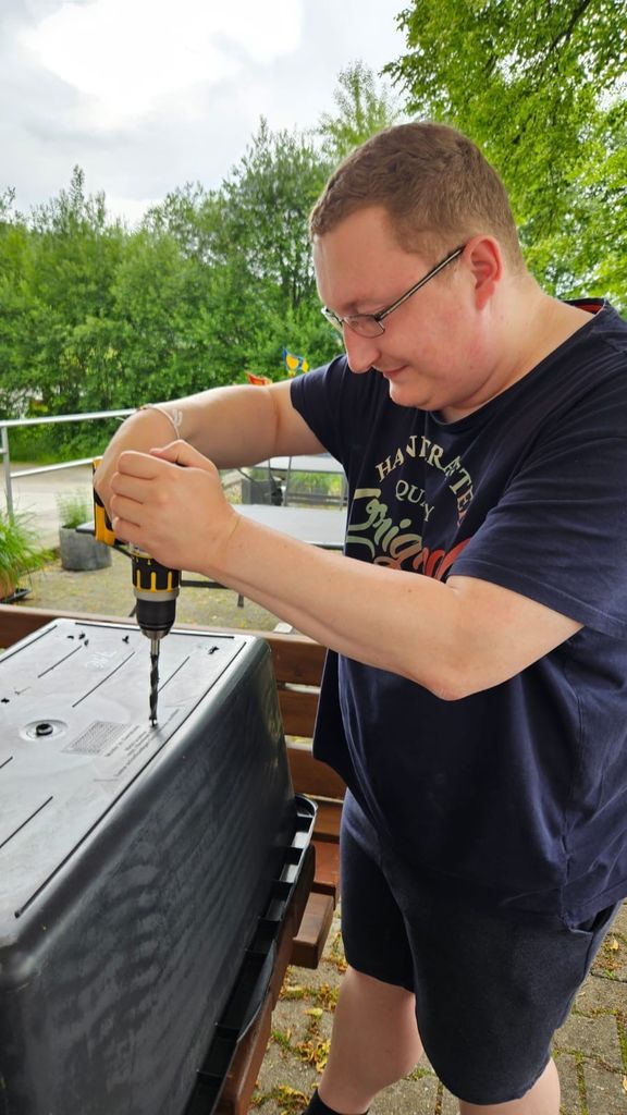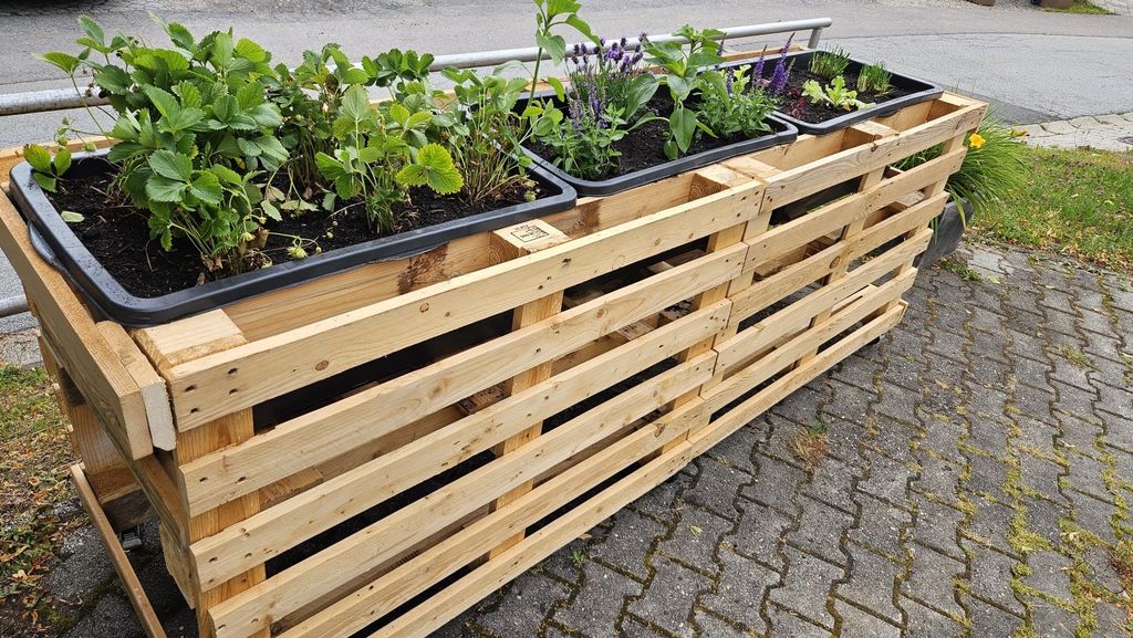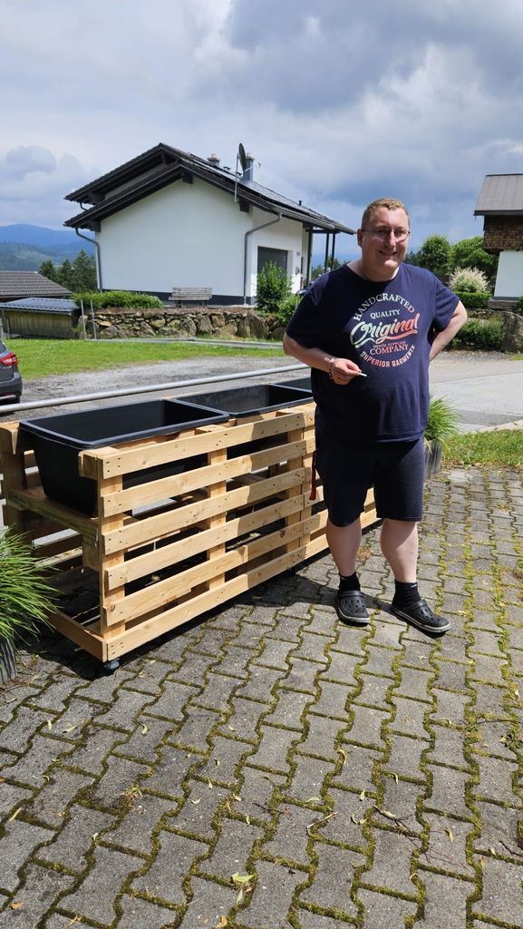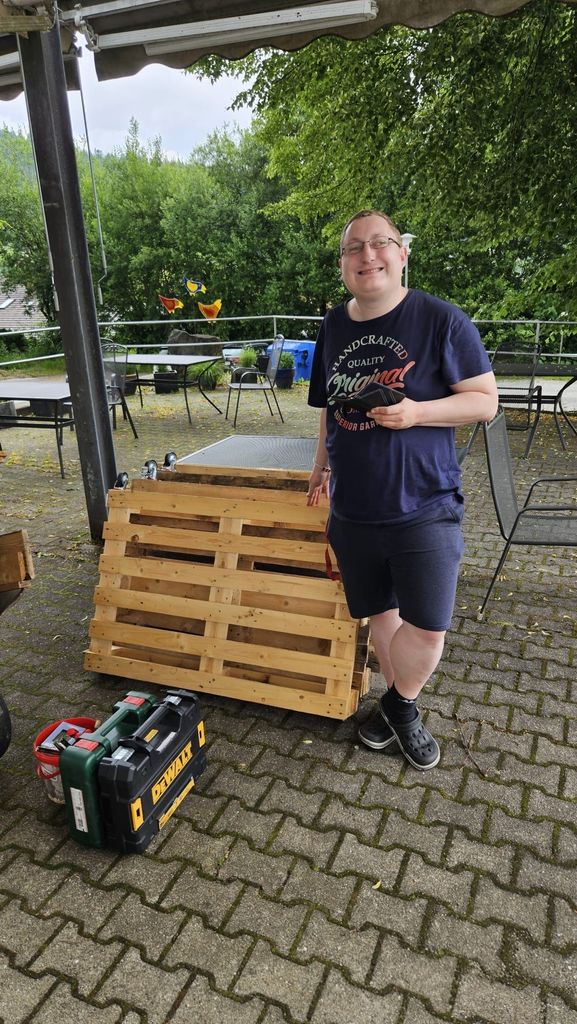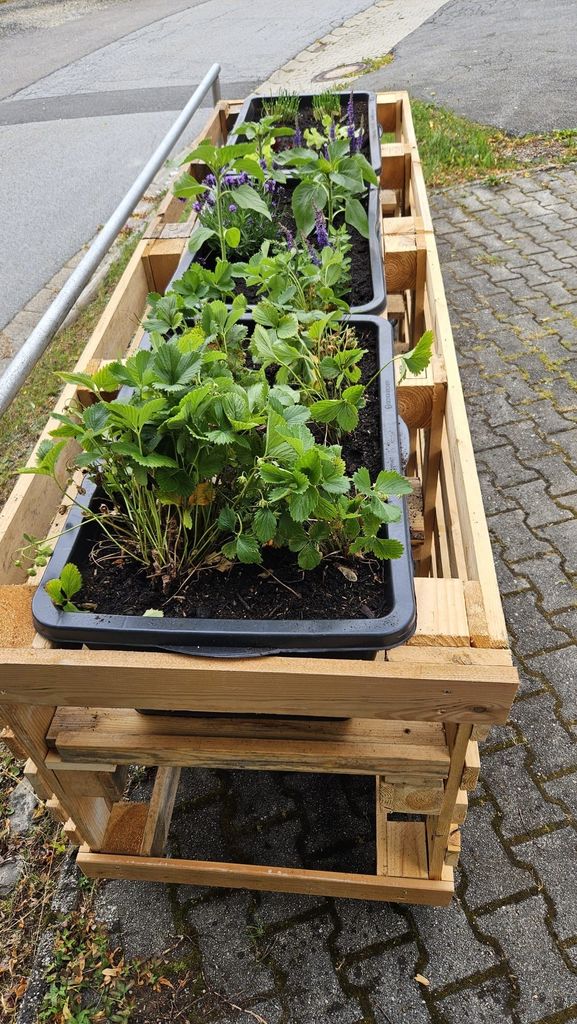 Da unsere Bewohner*innen sich einig sind, das im Sommer leckerer Salat mit frischen Kräutern nicht fehlen darf, entstand die Projektidee zum Hochbeetbau...Sofort traten unser Bewohner Herr Ricky Läufer mit Mitarbeiterin Frau Regina Oswald in die Planung. Zuerst wurde im Kopf geplant und skizziert. Die Idee eines Hochbeetes aus Paletten entstand. Gemeinsam wurden alle benötigten Materialien besorgt. Dann ging es endlich mit dem Bau los. Es wurde gehämmert, geschraubt und geschnitten. Nach einigen Tagen war es geschafft und das tolle Hochbeet wurde auf der Terasse in Rabenstein bestaunt. Jetzt hieß es los zum Baumarkt. Es musste Planzenerde und Pflänzchen besorgt werden. Seit dem Einpflanzen ist einige Zeit vergangen und das Hochbeet wurde gepflegt und gehegt. Mittlerweile erfreuen wir uns an den leckeren Erdbeeren und saftigen Salat mit kräftigen Kräutern. Vielen Dank an unsere "Hochbeetbauer".