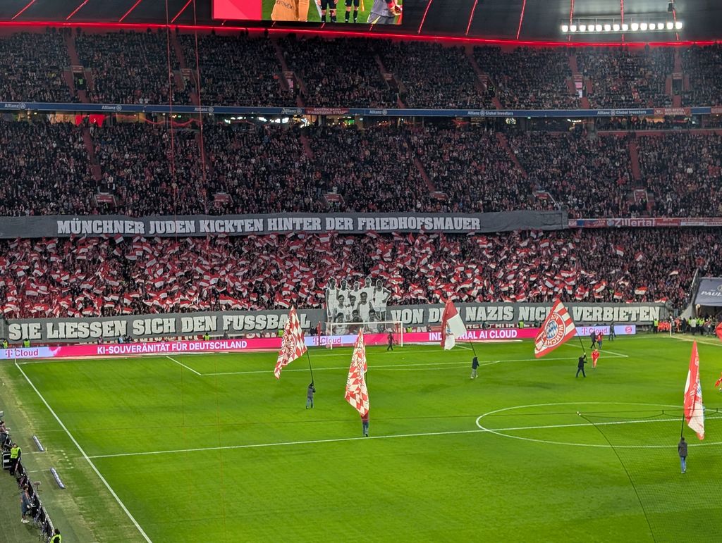 Die Fans des FC Bayern organisierten an diesem Spieltag eine Choreografie gegen Rassismus. Erinnert wurde dabei an die Münchner mit jüdischen Wurzeln, denen das Sporttreiben durch das SS Regime untersagt wurde.