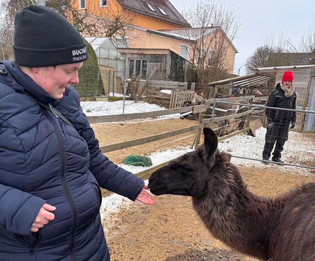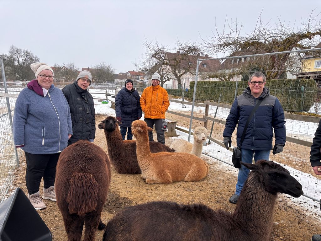 Am vergangenen Samstag machten sich einige Bewohner des Hauses Feistelholz aus Region Wernberg auf den Weg zum Hof der Mavi Alpakas in Vohenstrauß, wo sie die erste Einheit der tiergestützten Pädagogik erleben durften.Nach einem herzlichen Empfang begann eine behutsame Kontaktaufnahme mit den Tieren. Gemeinsam haben die Teilnehmenden die auf dem Hof lebenden Schafe, Alpakas, Lamas, Hühner und Hasen kennengelernt. Zu jeder Tierart wurde ein kurzer Steckbrief vorgestellt, der Wissenswertes über Herkunft, Verhalten und Besonderheiten vermittelte.