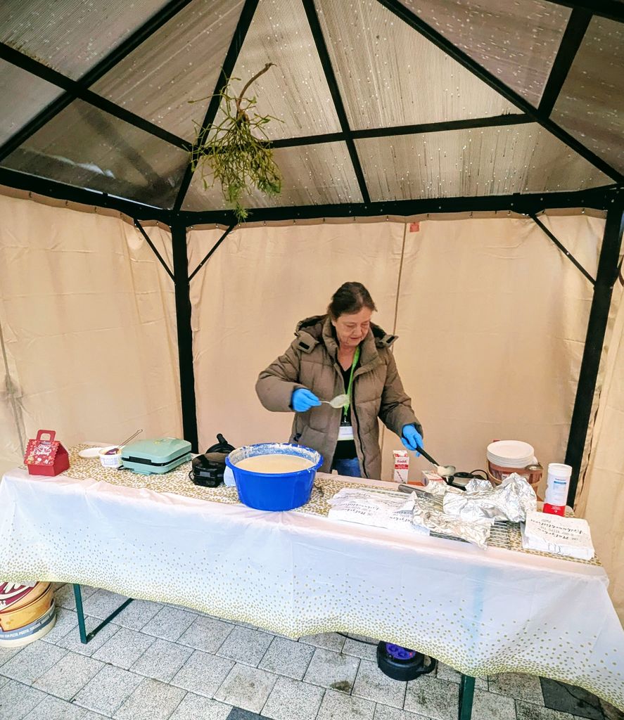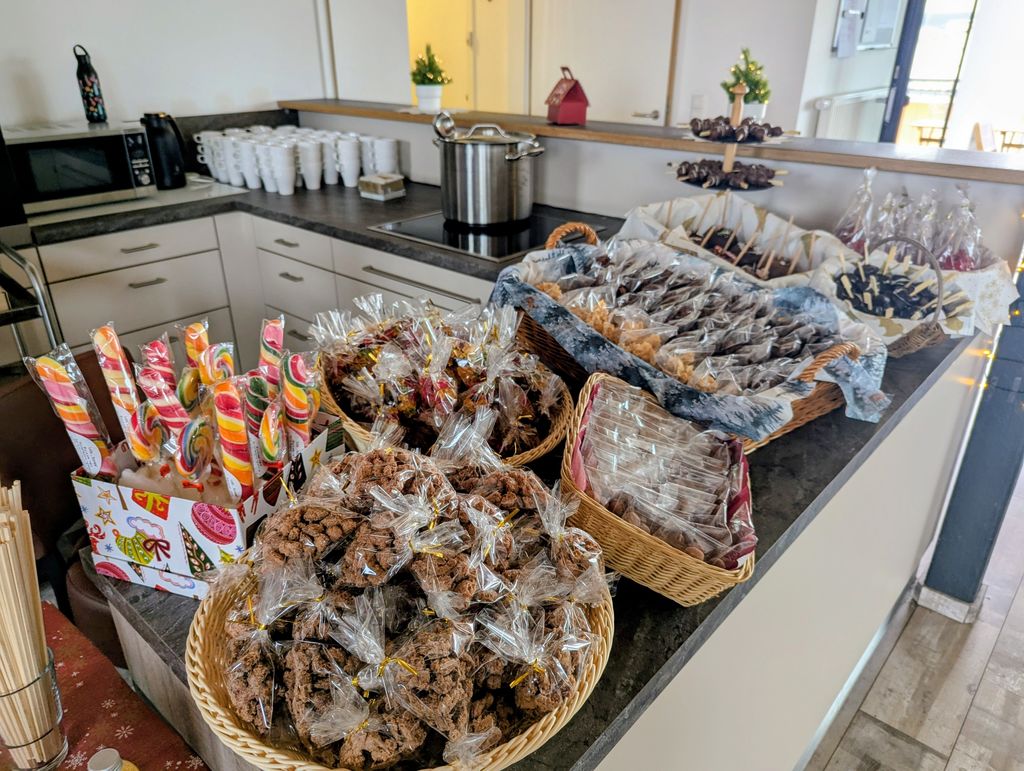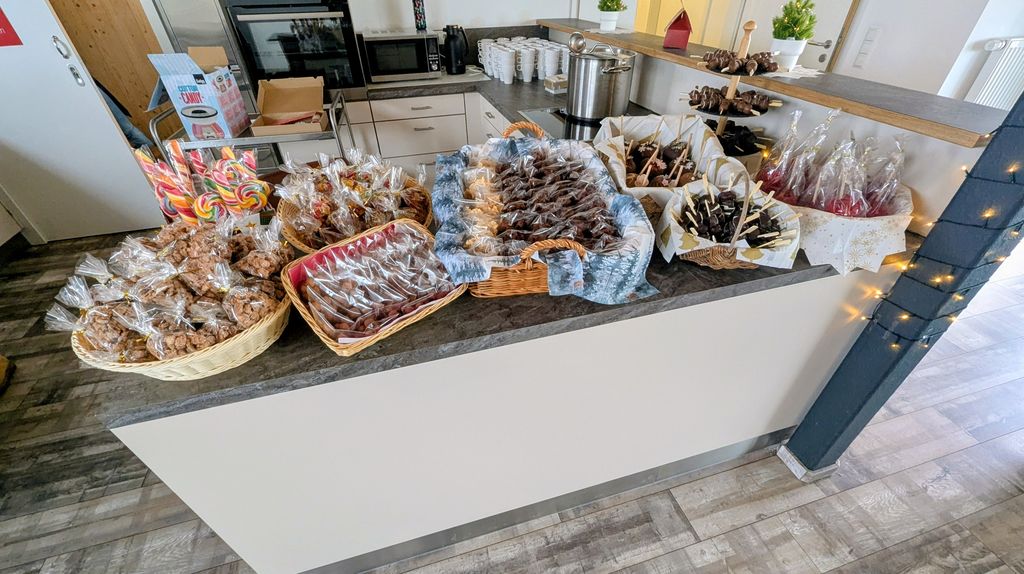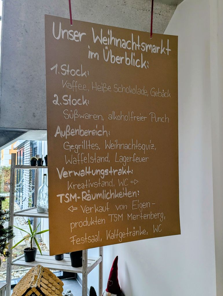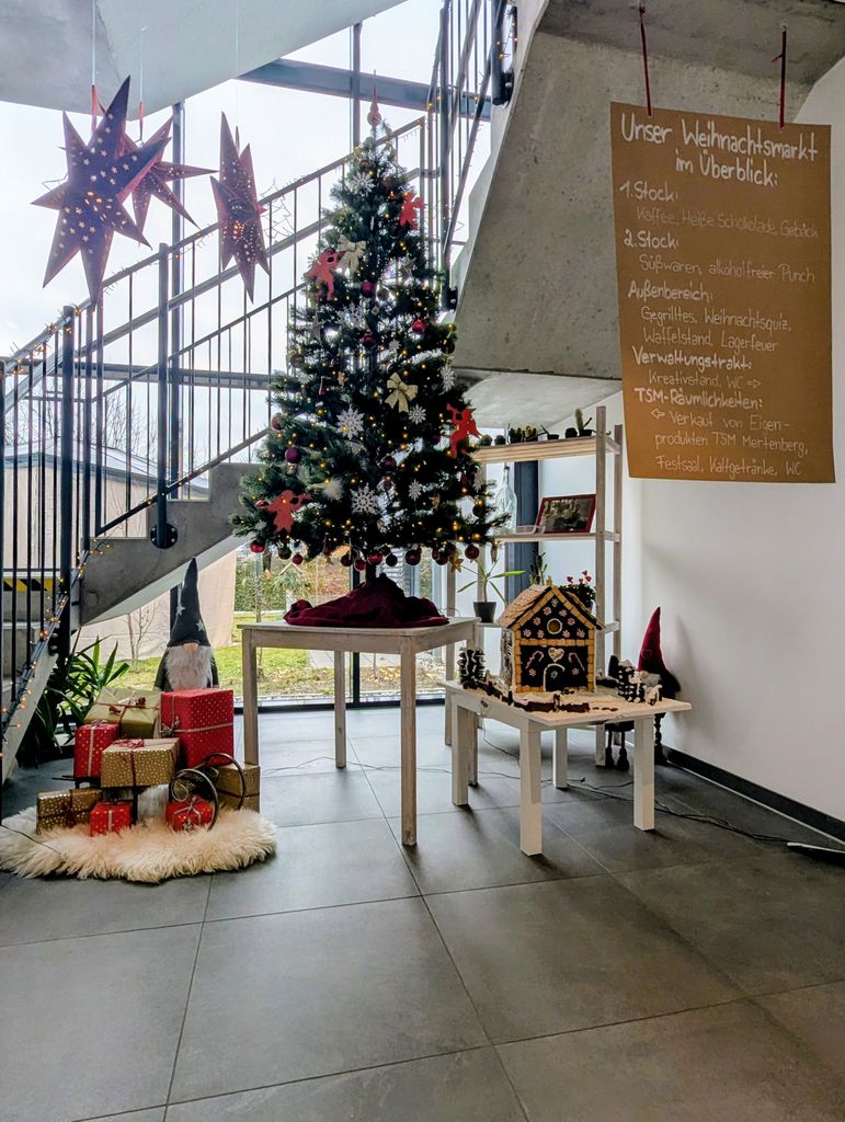 Neben einem breiten Angebot weihnachtlicher Leckereien und Speisen vom Grill, einem atmosphärischen Lagerfeuer sowie eines Besuchs des Nikolaus, fanden auch ein Weihnachtsquiz und der Verkauf von Eigenprodukten aus den TSM`s Mertenberg und SAD statt.