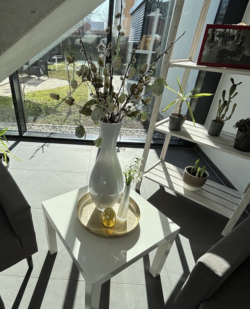 In den letzten Tagen haben wir unsere Osterdeko ausgepackt.Nun können wir uns an süßen Osterhasen, bunten Ostereiern und sämtlichen wunderschönen Frühjahrsblühern erfreuen.