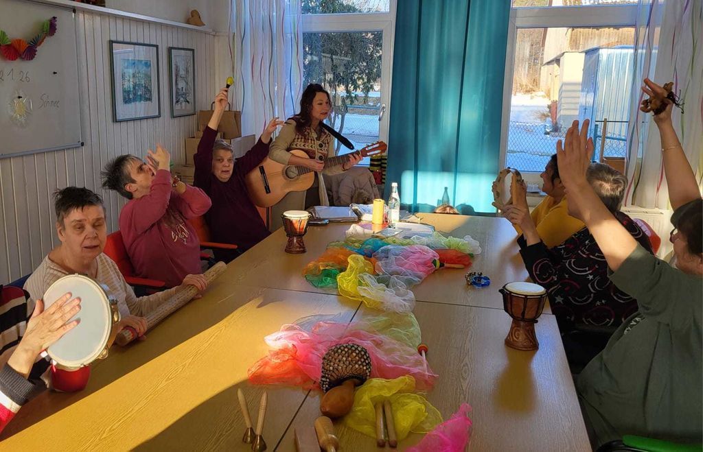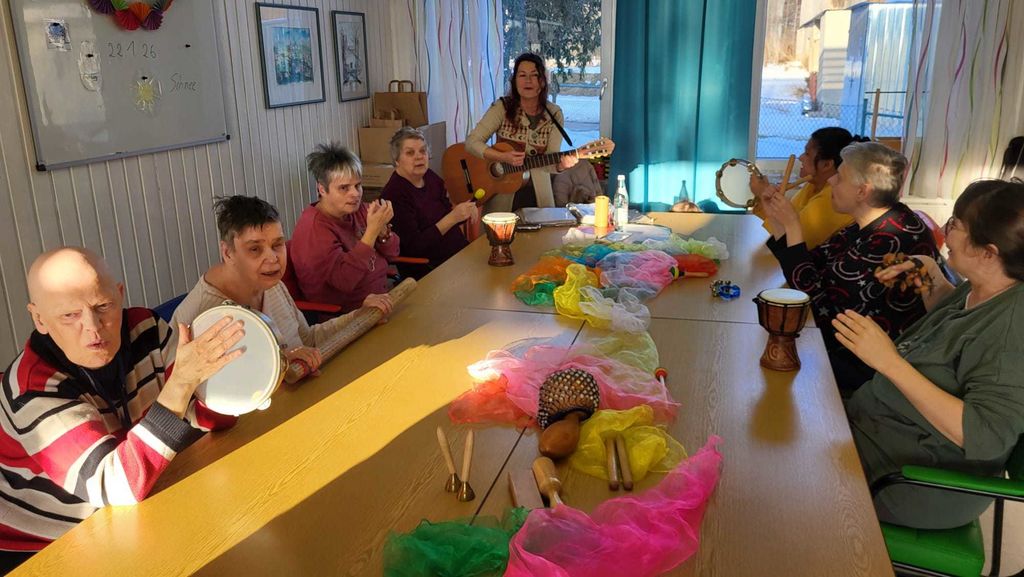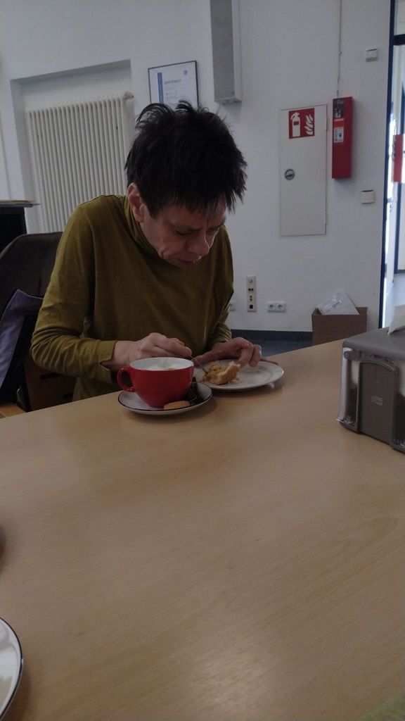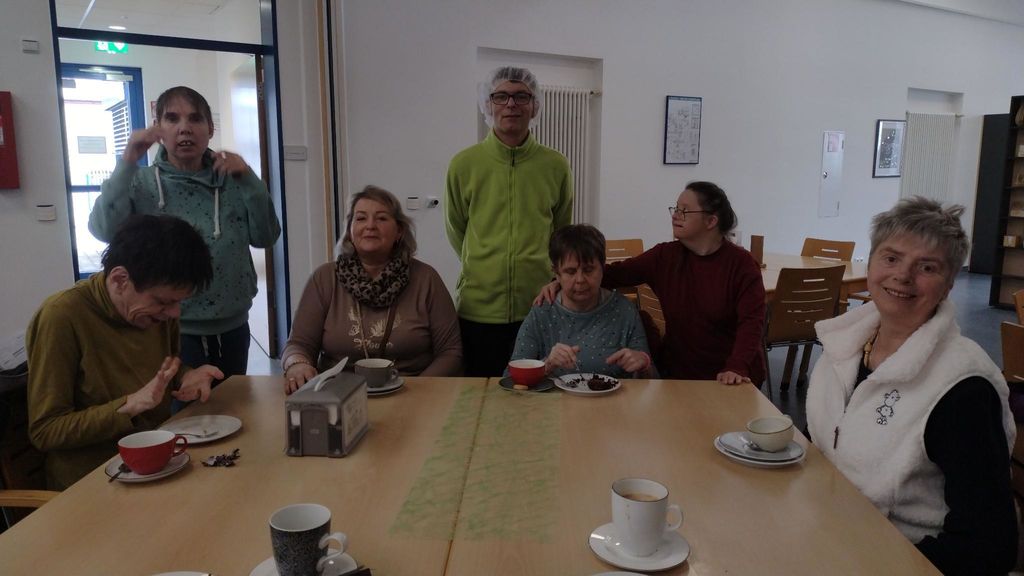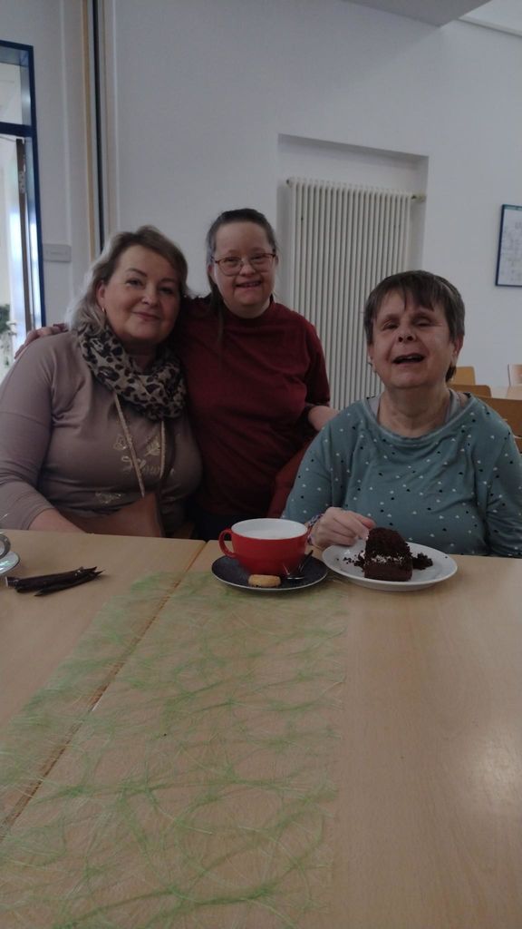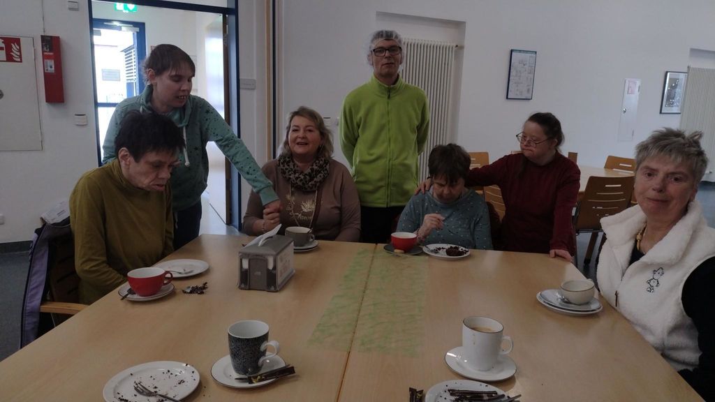 Kaffee trinken und etwas "ratschen" mit unseren MitbewohnerInnen :-)Heute besuchten wir unsere MitbewohnerInnen in der WfbM. Wir tranken gemütlich Kaffee und aßen ein Stück Kuchen. Unser Thorsten bediente uns, und alle freuten sich über unseren Besuch. In der Tannenschleife freuten sich die BewohnerInnen, dass die Musiktherapie wieder losging und im Haus Oberviechtach wurden selbst Käsespätzle gemacht, die wir am Abend dann genüsslich verspeisten.