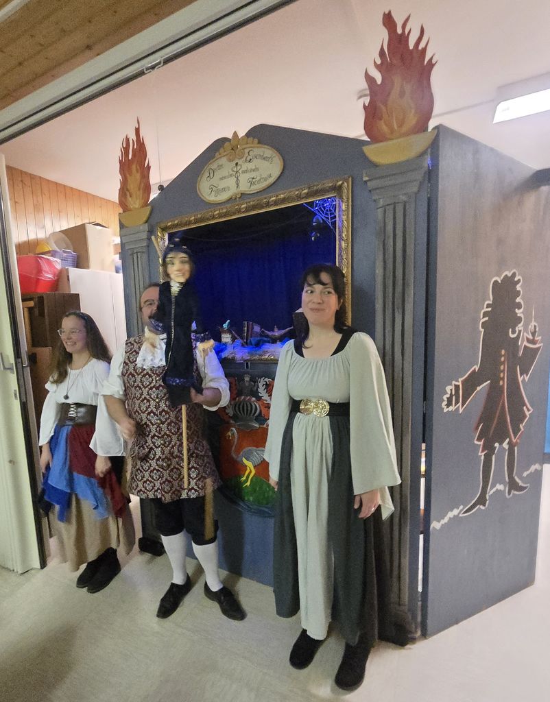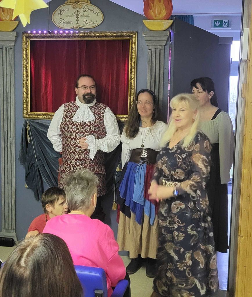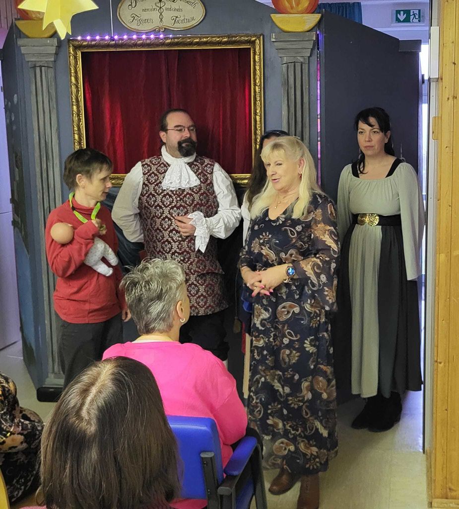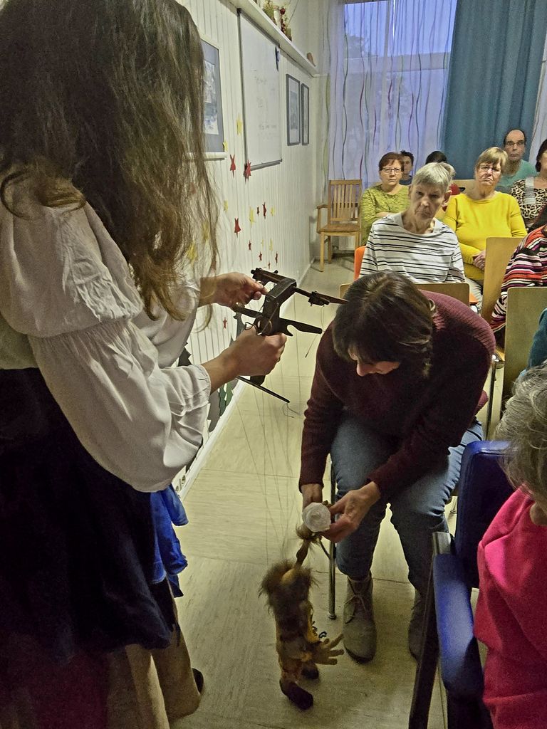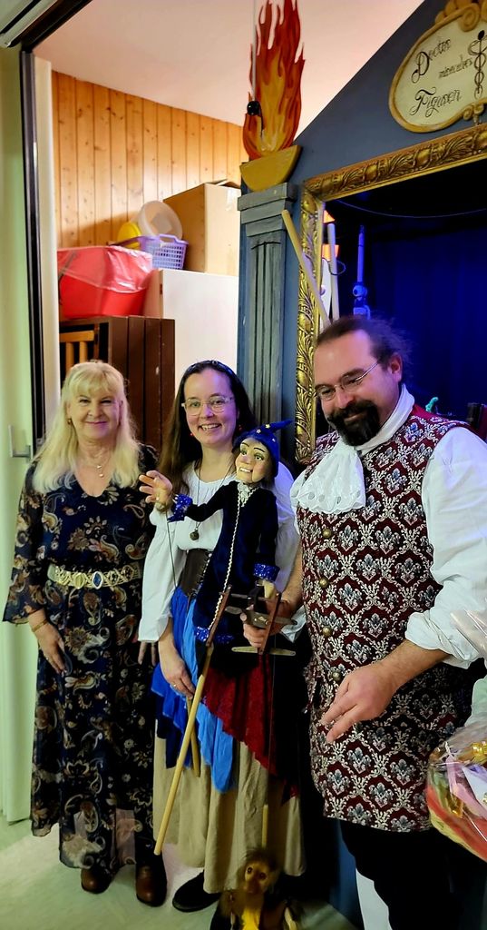 Voller Vorfreude empfingen wir heute das Figuren Theater des Dr. Eisenbarth Festspiel Vereins Oberviechtach :-)Heute konnten wir uns auf etwas ganz Besonderes freuen. Am Nachmittag fand bei uns im Haus Tannenschleife die Vorführung des Figuren Theaters Dr. Eisenbarth statt. Wir konnten 2 Stücke genießen, einmal " Dr. Eisenbarth verschreibt ein Gewitter" und " Der Zauberlehrling". Wir waren alle voll dabei, es war sehr schön und wir hatten viel Freude :-) In der Pause zwischen den beiden Stücken, verteilte der kleine,süße " Hagebutt" an jeden Zuschauer eine selbstgemachte Rose. Im Anschluss aßen wir gemeinsam noch zu Abend, es gab lecker Schnitzel, dies hatten wir uns gewünscht. Ein rießen Dankeschön an die "Puppenspieler", es war ein unvergeßlicher, toller Nachmittag, wir sehen uns sicher im neuen Jahr wieder !
