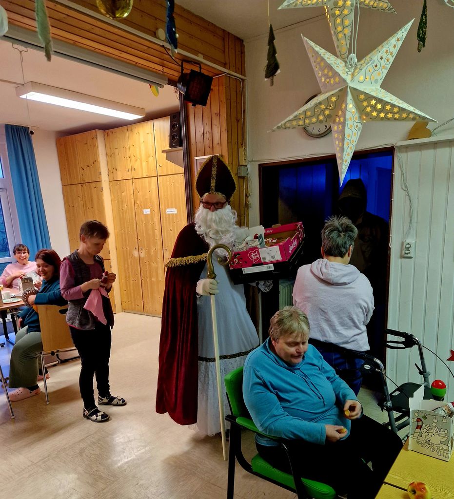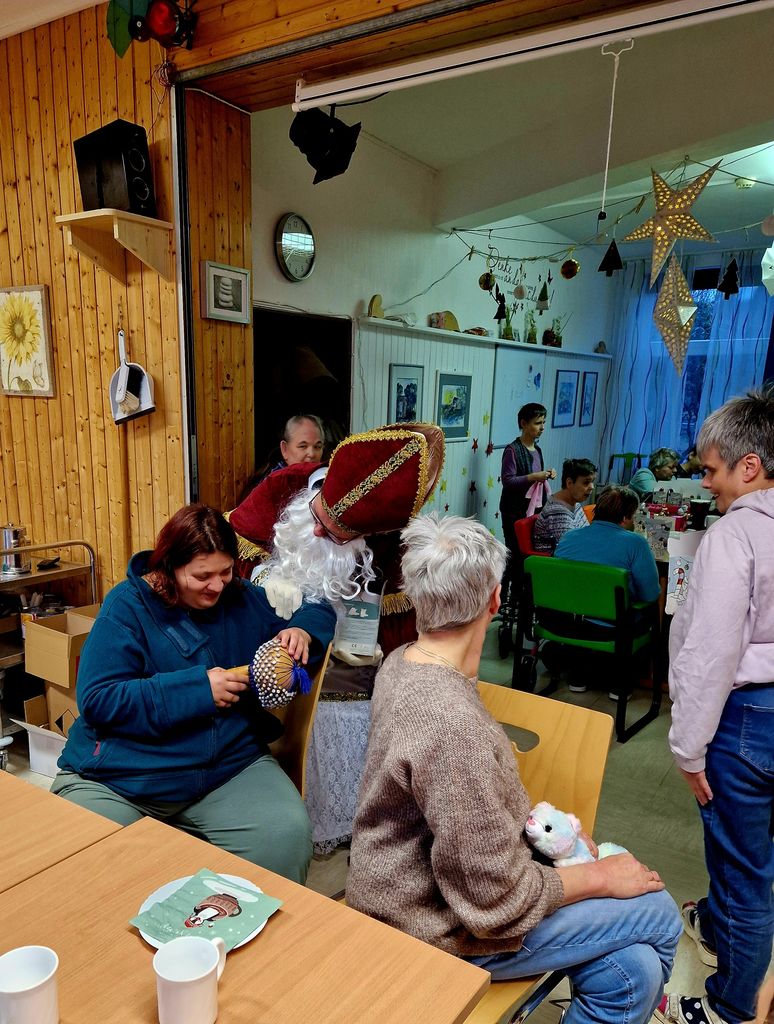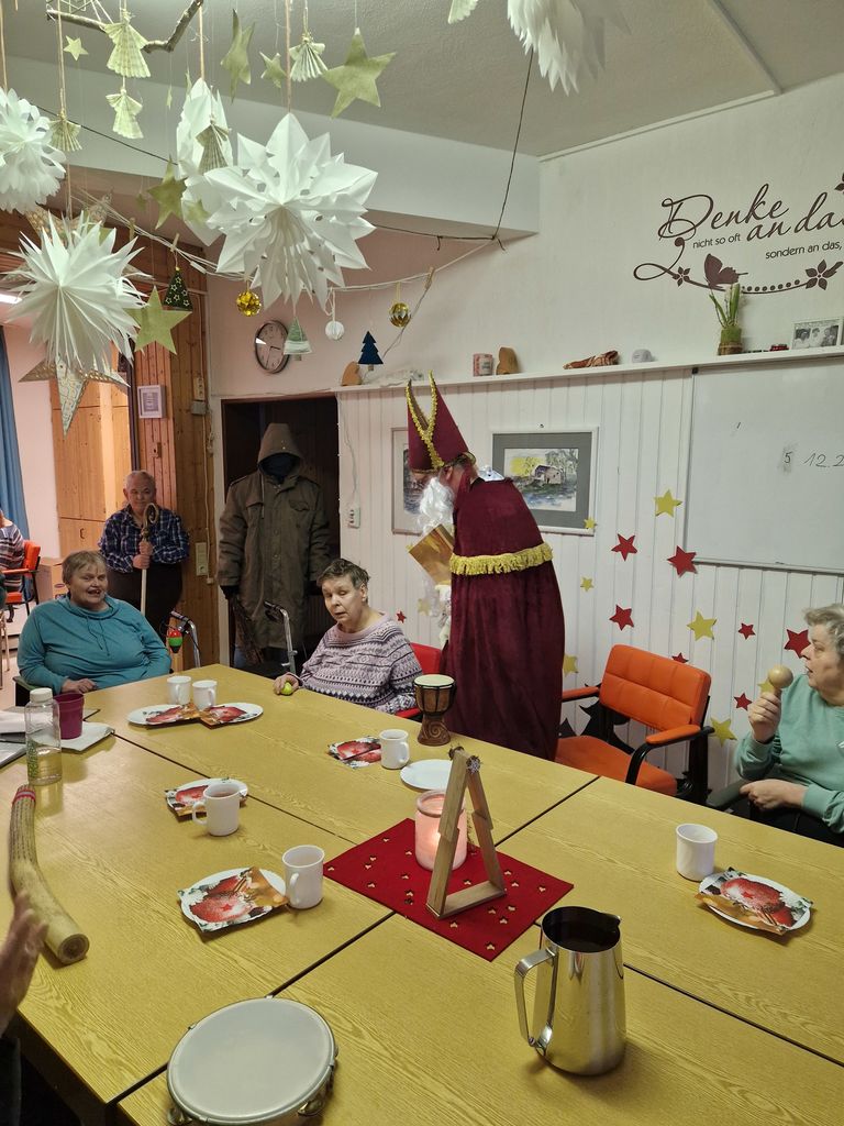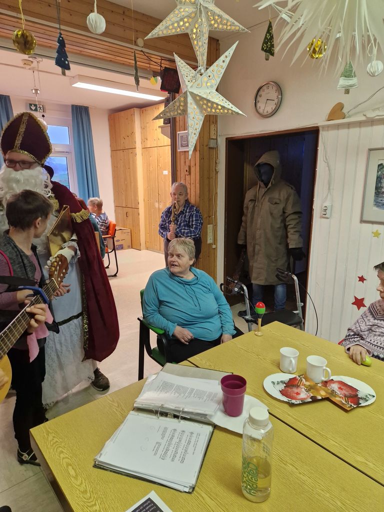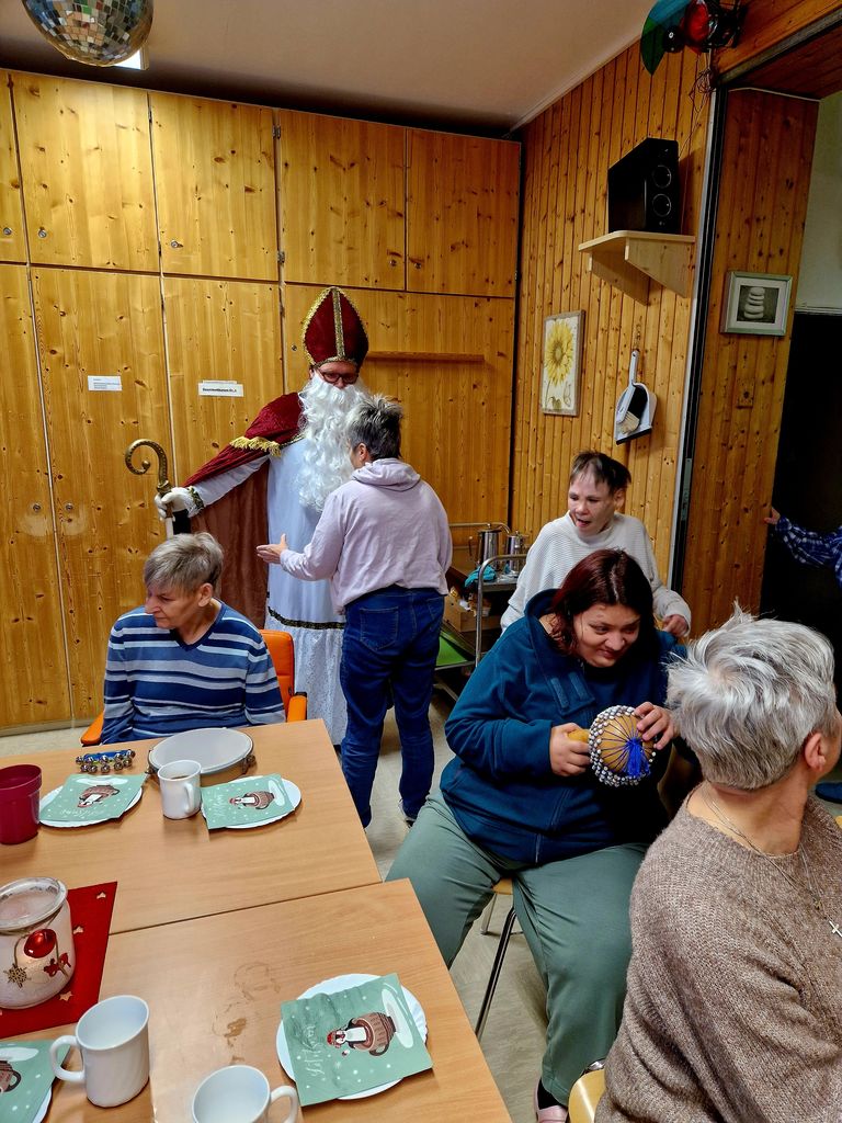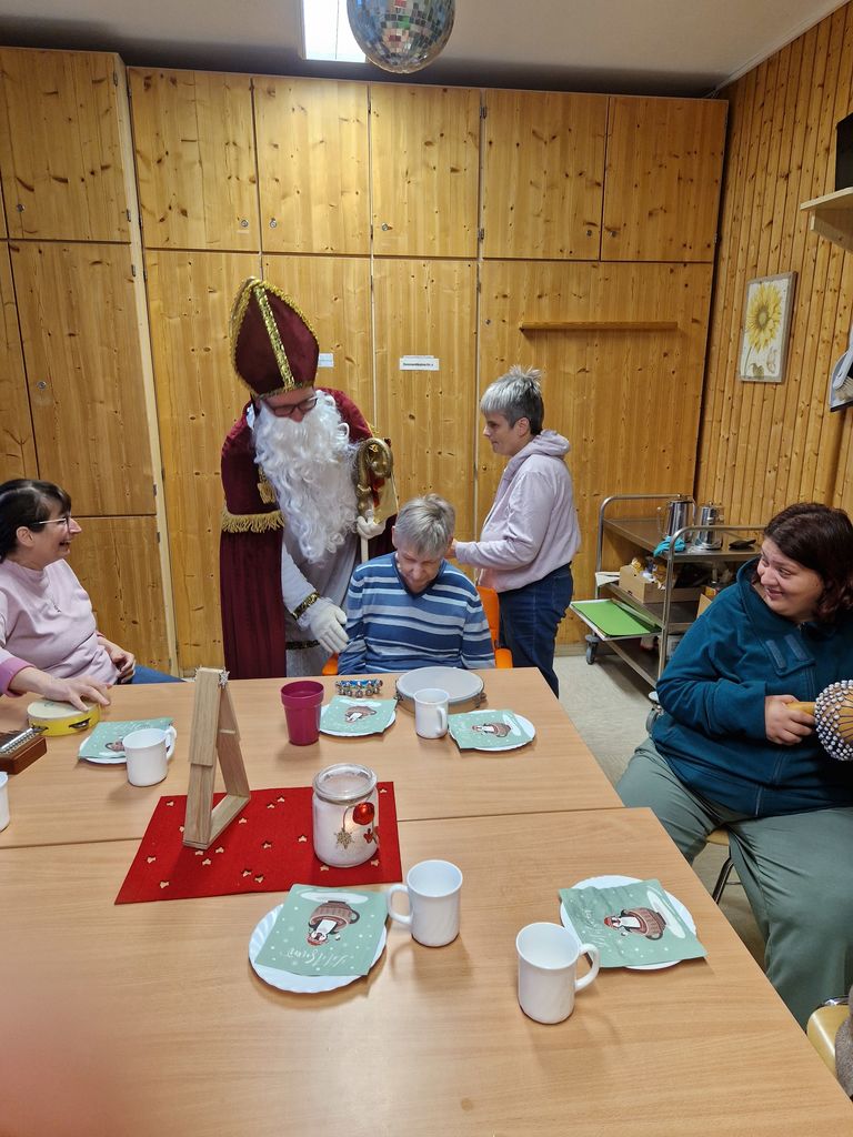 Hurra, hurra der Nikolaus ist da!Am heutigen Nachmittag trafen wir uns alle im TSM- Raum. Wir sangen schöne Weihnachtslieder,die Ortrud mit ihrer Gitarre begleitete. Es gab lecker Punsch, selbstgebackene Plätzchen und Lebkuchen. Gegen Abend klopfte es laut an der Tür,der Nikolaus kam herein und zauberte uns allen ein Lächeln ins Gesicht, denn er hatte für jeden eine kleine Überraschung dabei. Vielen Dank lieber Nikolaus, komm gern nächstes Jahr wieder zu uns ins Haus.