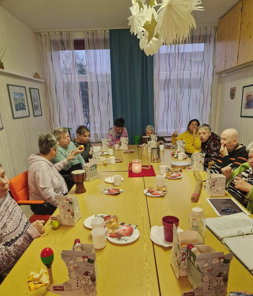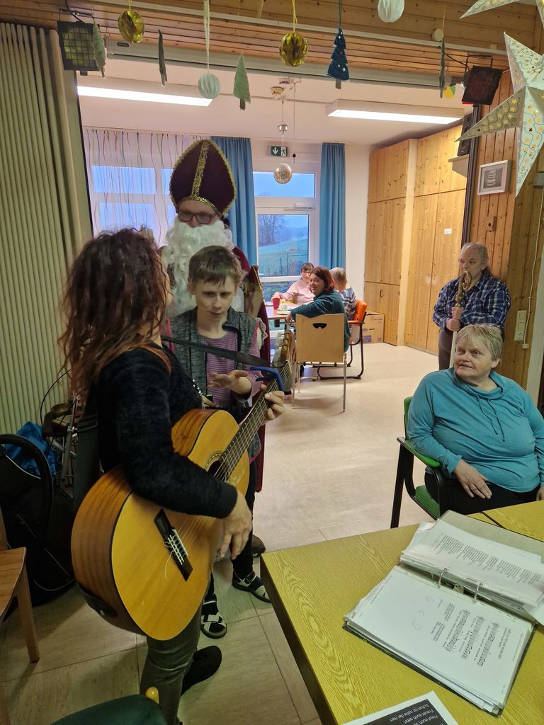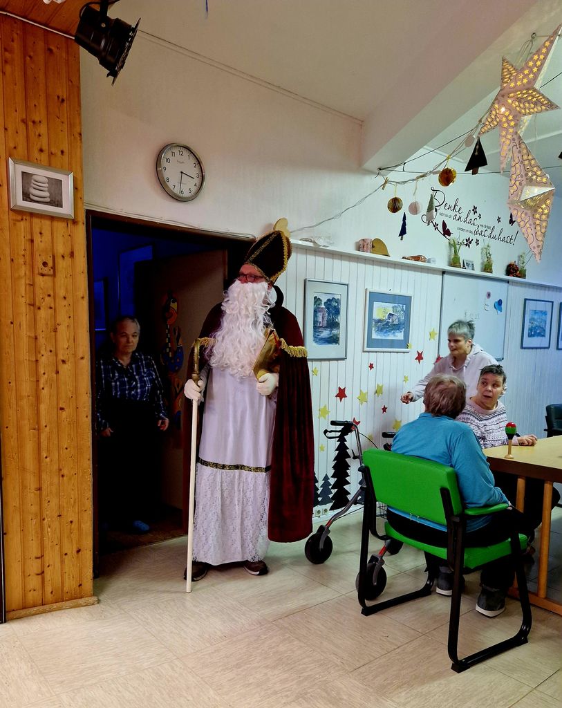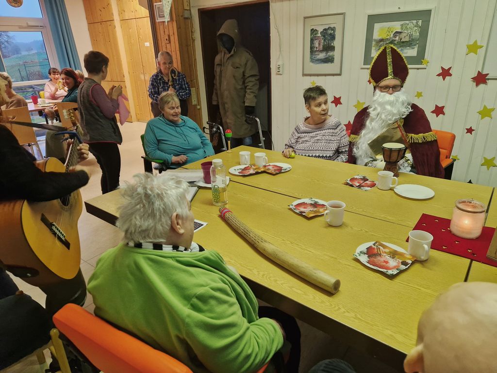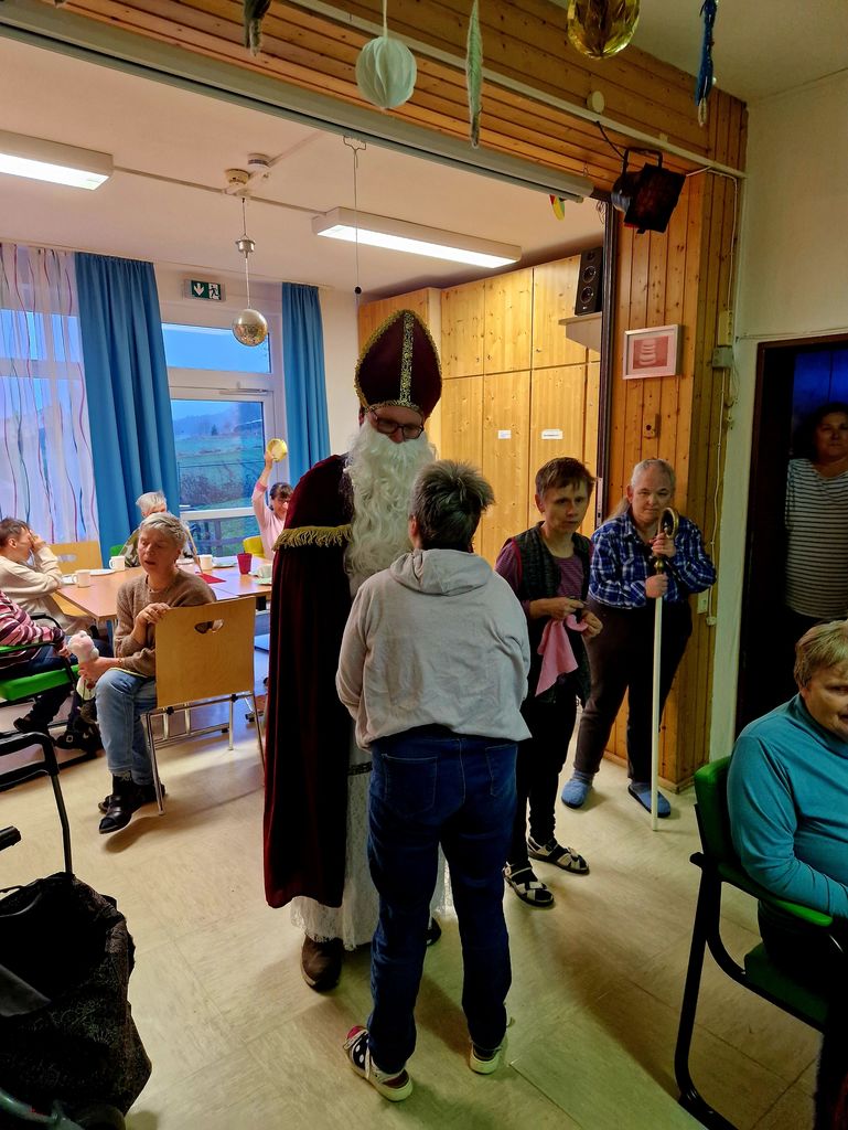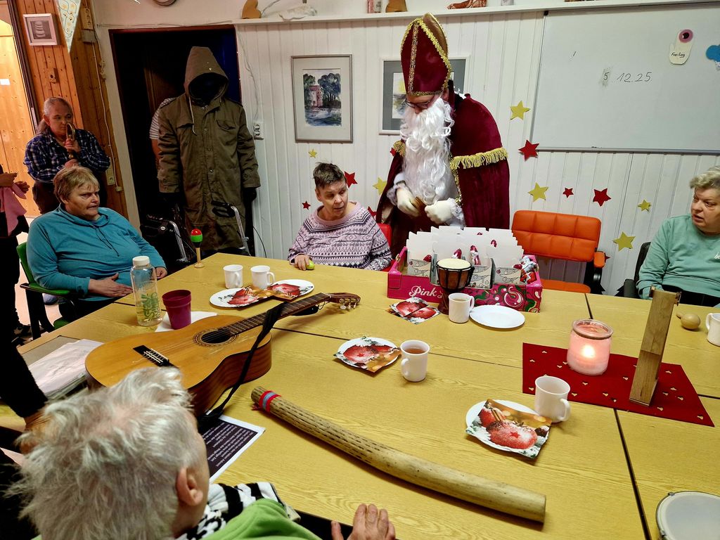 Hurra, hurra der Nikolaus ist da!Am heutigen Nachmittag trafen wir uns alle im TSM- Raum. Wir sangen schöne Weihnachtslieder,die Ortrud mit ihrer Gitarre begleitete. Es gab lecker Punsch, selbstgebackene Plätzchen und Lebkuchen. Gegen Abend klopfte es laut an der Tür,der Nikolaus kam herein und zauberte uns allen ein Lächeln ins Gesicht, denn er hatte für jeden eine kleine Überraschung dabei. Vielen Dank lieber Nikolaus, komm gern nächstes Jahr wieder zu uns ins Haus.