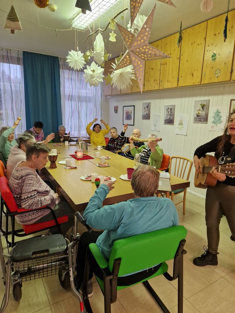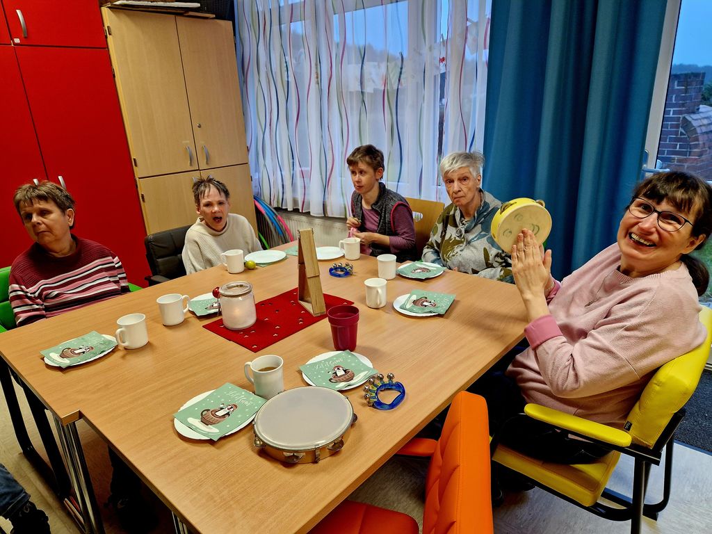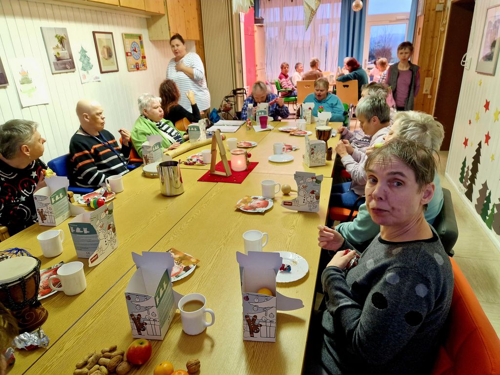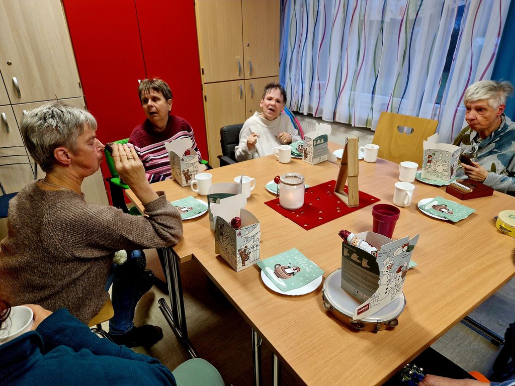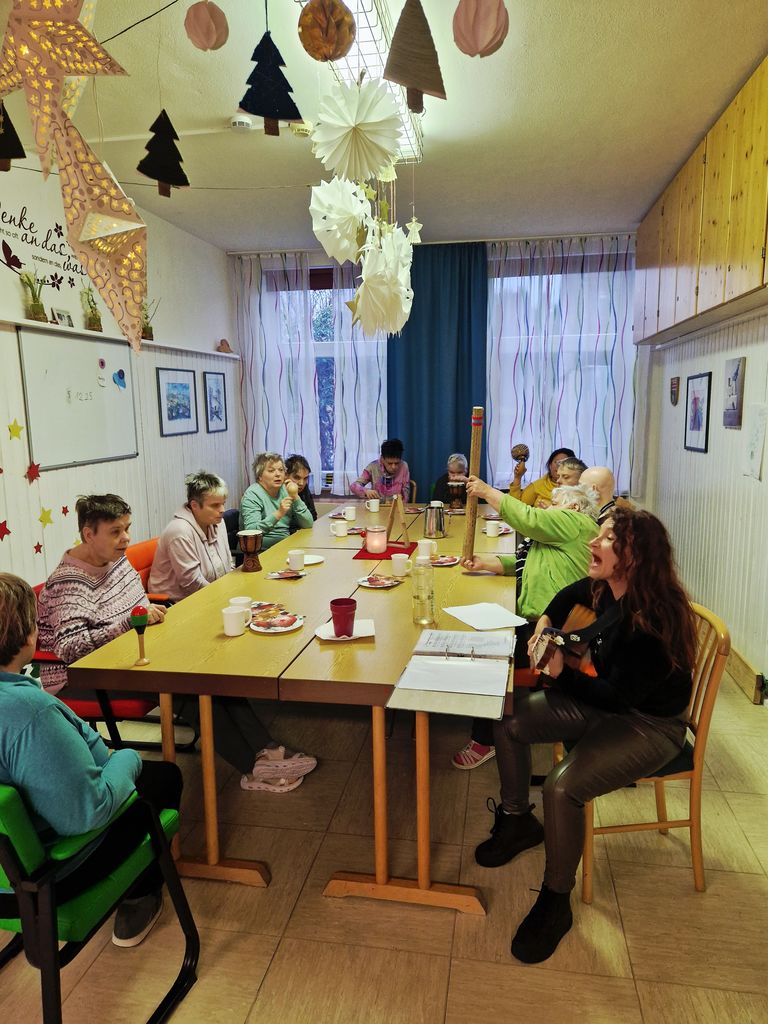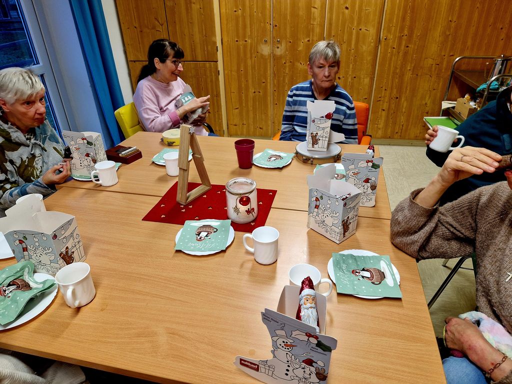 Hurra, hurra der Nikolaus ist da!Am heutigen Nachmittag trafen wir uns alle im TSM- Raum. Wir sangen schöne Weihnachtslieder,die Ortrud mit ihrer Gitarre begleitete. Es gab lecker Punsch, selbstgebackene Plätzchen und Lebkuchen. Gegen Abend klopfte es laut an der Tür,der Nikolaus kam herein und zauberte uns allen ein Lächeln ins Gesicht, denn er hatte für jeden eine kleine Überraschung dabei. Vielen Dank lieber Nikolaus, komm gern nächstes Jahr wieder zu uns ins Haus.