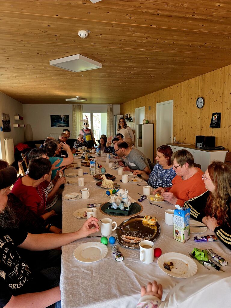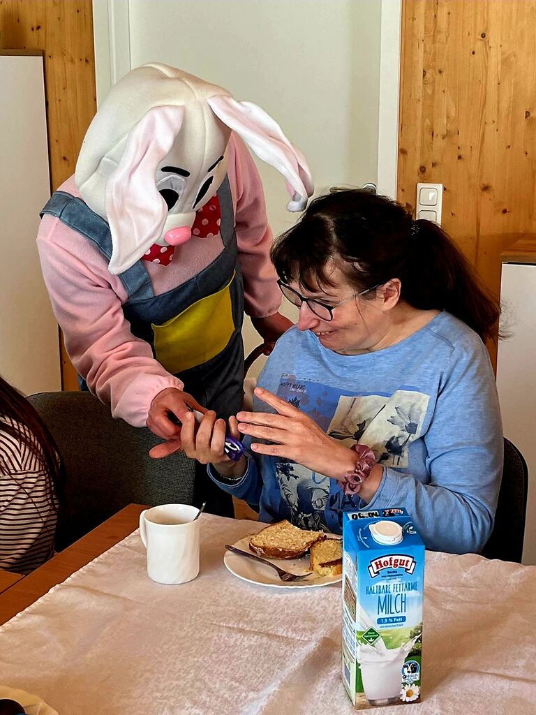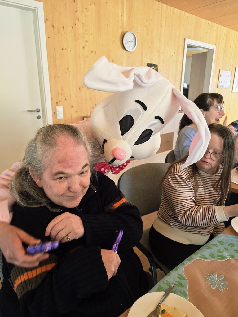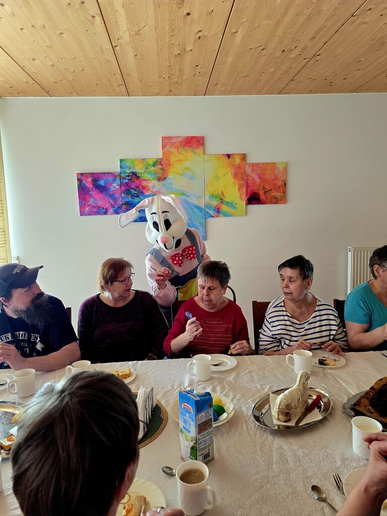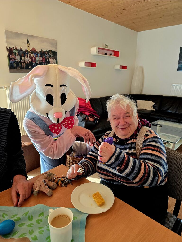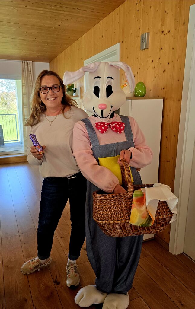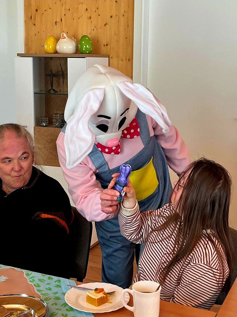 Wir verabschieden den "Osterhasen" :-)Heute, am Ostermontag trafen wir uns alle nochmal gemütlich zu Kaffee und Kuchen. (Natürlich war der Kuchen wieder selbst gebacken). Gemeinsam mit unseren Gästen aus der Tannenschleife, ließen wir uns den Kuchen schmecken. Auf einmal ging die Tür auf, und was sahen wir ? Der "Osterhase" schaute noch einmal kurz vorbei und hatte für uns in seinem Korb etwas Süßes dabei. Wir freuten uns natürlich sehr und verabschiedeten den "Osterhasen" gebührend. Rundum waren es für uns sehr schöne, abwechslungsreiche aber auch erholsame Osterfeiertage!