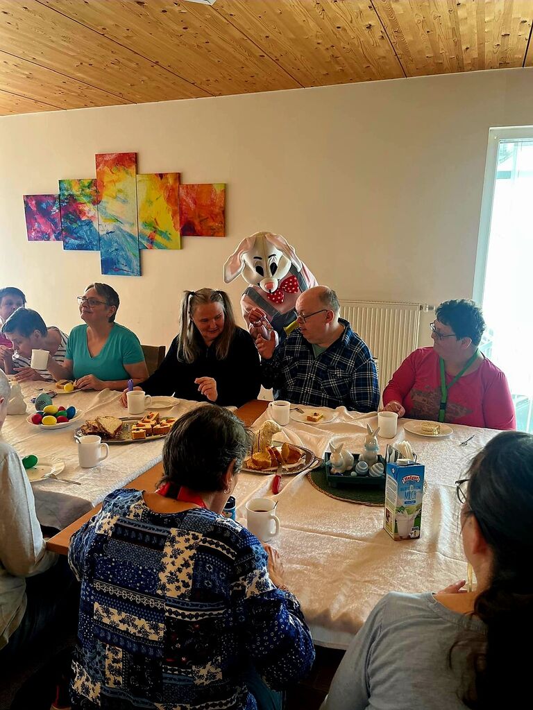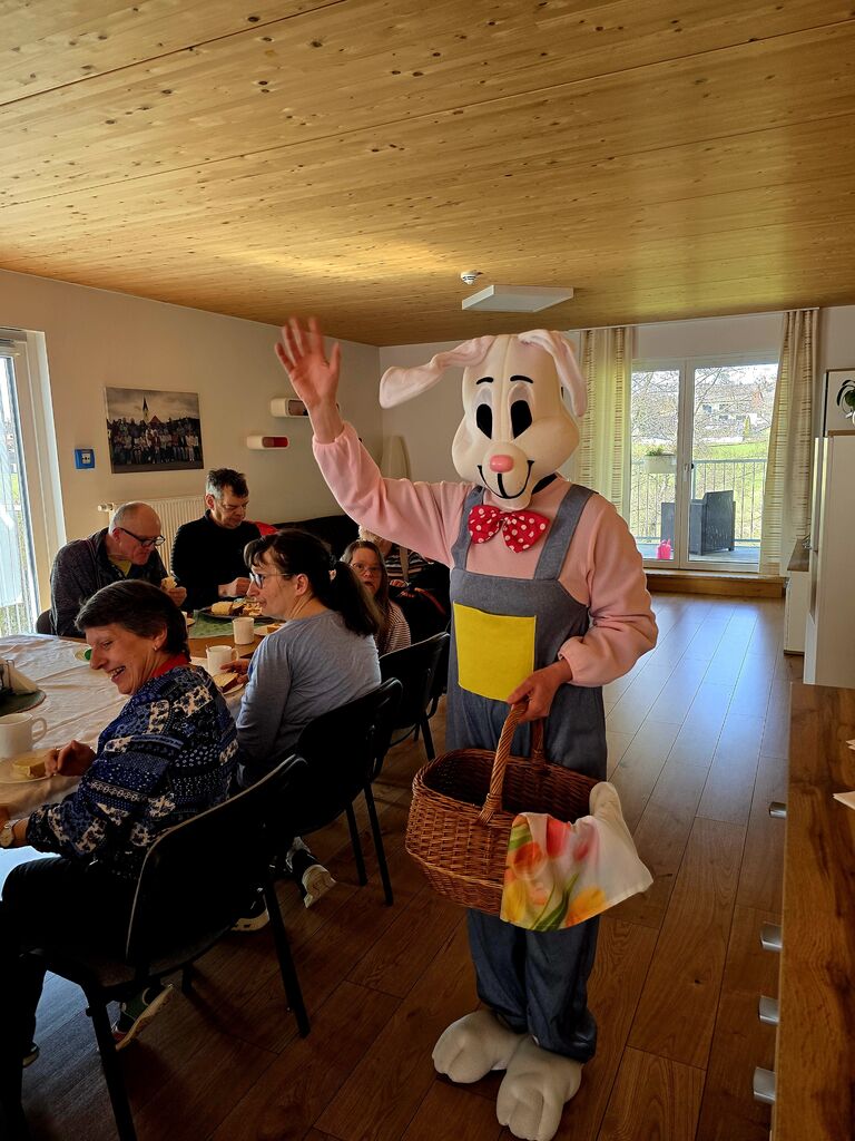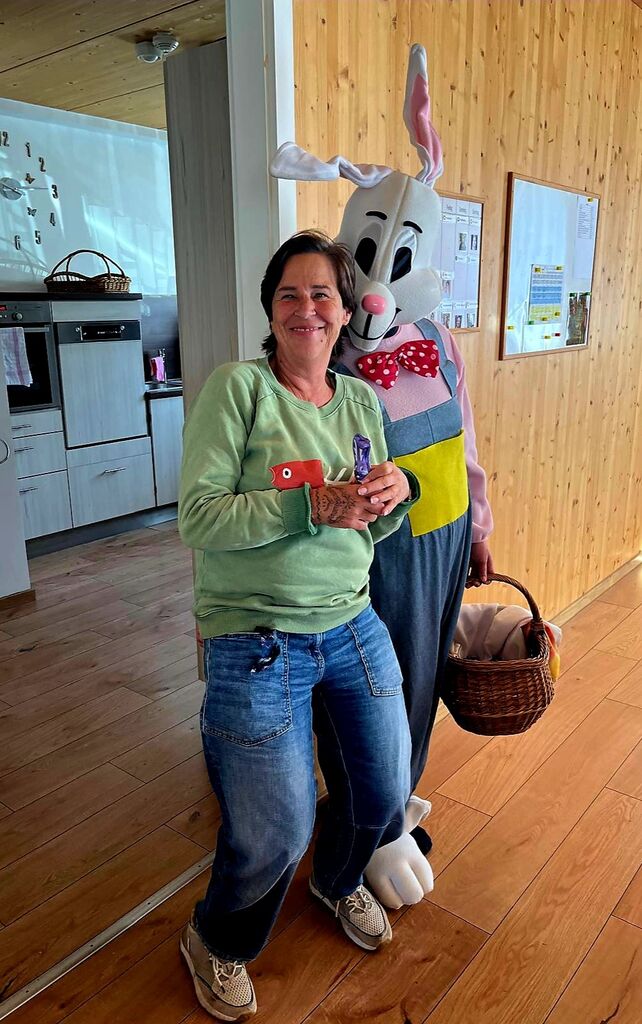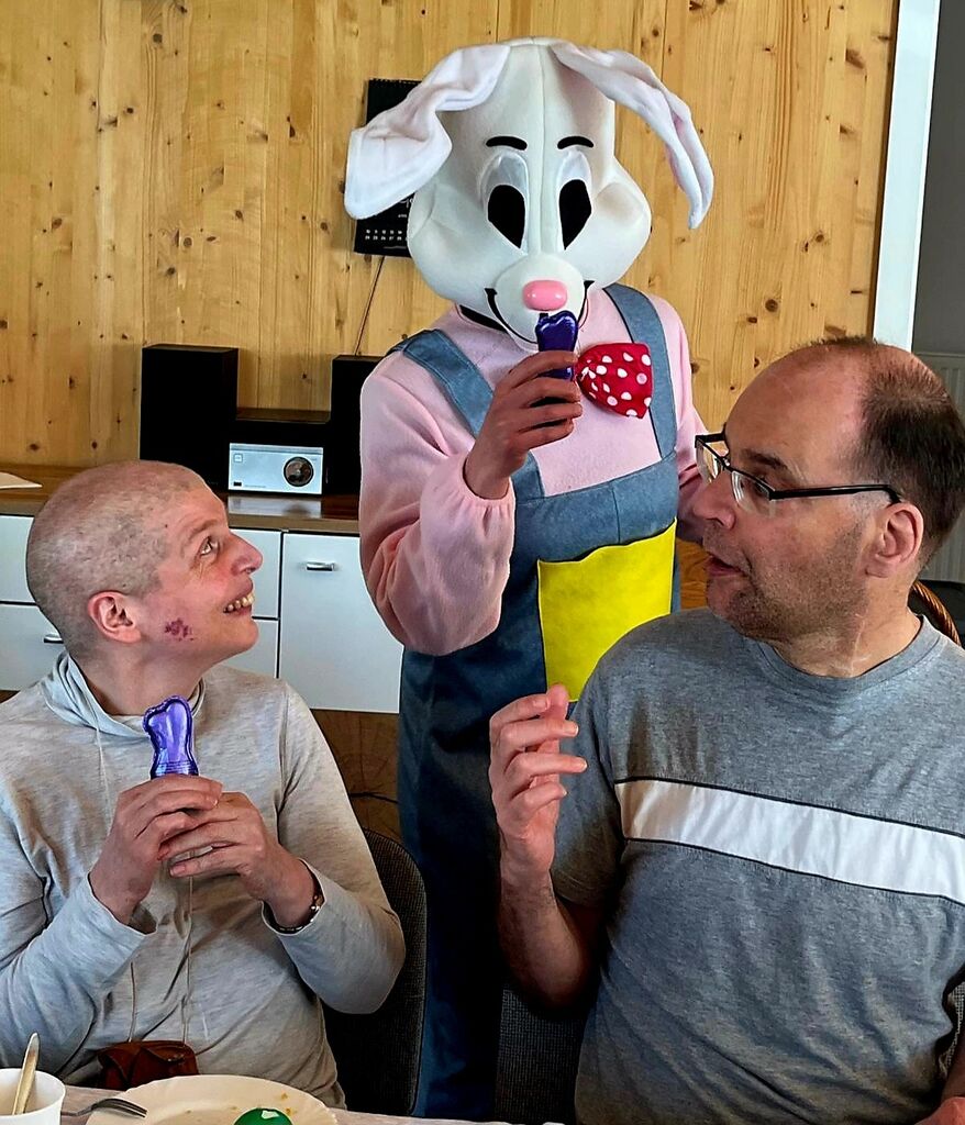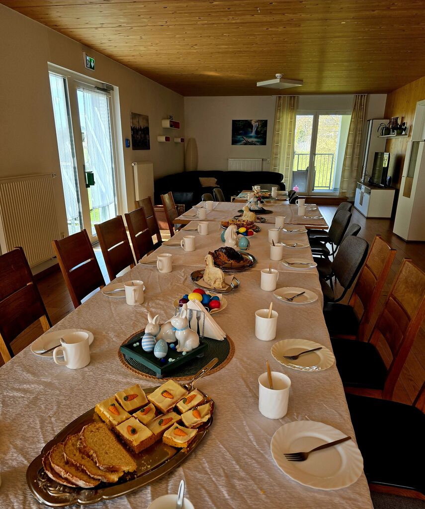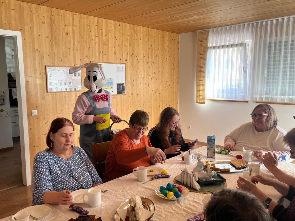 Wir verabschieden den "Osterhasen" :-)Heute, am Ostermontag trafen wir uns alle nochmal gemütlich zu Kaffee und Kuchen. (Natürlich war der Kuchen wieder selbst gebacken). Gemeinsam mit unseren Gästen aus der Tannenschleife, ließen wir uns den Kuchen schmecken. Auf einmal ging die Tür auf, und was sahen wir ? Der "Osterhase" schaute noch einmal kurz vorbei und hatte für uns in seinem Korb etwas Süßes dabei. Wir freuten uns natürlich sehr und verabschiedeten den "Osterhasen" gebührend. Rundum waren es für uns sehr schöne, abwechslungsreiche aber auch erholsame Osterfeiertage!